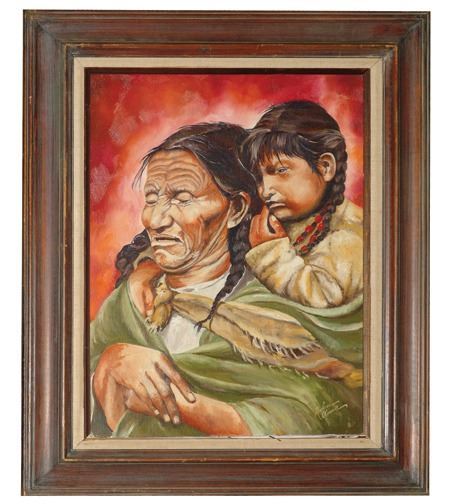 Ca. 1974, Signed original oil on canvas depicting a sad faced Indian woman and child. Good condition, frame damaged. From Scottsdale, Arizona. 24" x 18" (32" x 26" framed)