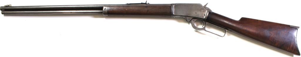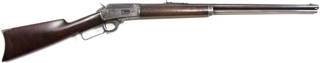 Marlin 1894 .25-20 cal. SN 395450 lever action rifle with 24" round barrel, full mag and standard walnut stocks, crescent iron buttplate. Remains good, barrel and mag tube show pleasing silver gray patina, receiver gray with scattered traces of muted ca lever action rifle with 24" round barrel, full mag and standard walnut stocks, crescent iron buttplate. Remains good, barrel and mag tube show pleasing silver gray patina, receiver gray with scattered traces of muted case color on right side, original forend good to very good, rear buttstock period replacement with repaired crack on right side of wrist, great action with poor bore. Modern.