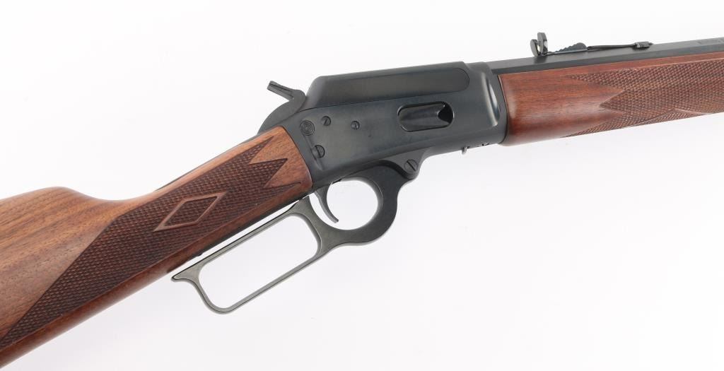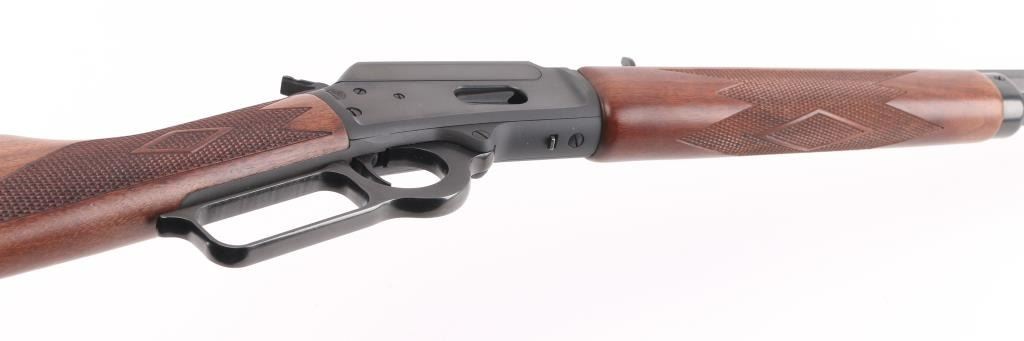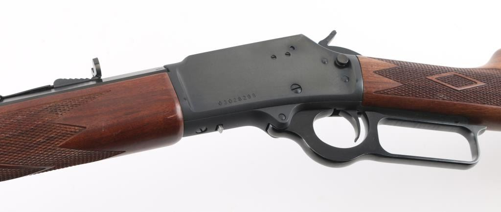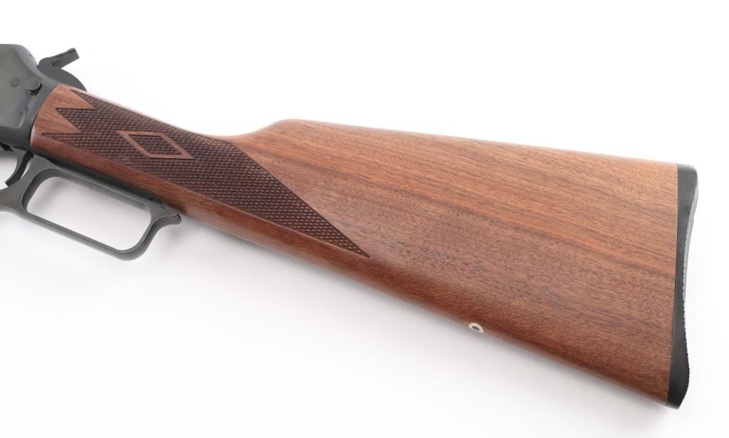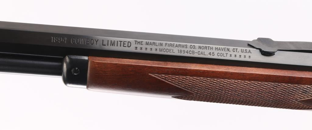 'Cowboy Limited' "JM" marked barrel. Lever action rifle features blued finish, 24" octagon barrel, blade front sight, buckhorn rear sporting sight, full length magazine tube held to barrel with a screw (no bands), pushbutton cross bolt safety. Two piece walnut stocks are checkered, straight wrist, with a checkered black plastic Marlin buttplate. Bore is pristine. Retains 98% blue with handling marks. Wood is excellent. Condition is NRA Excellent *** Modern Firearm ***