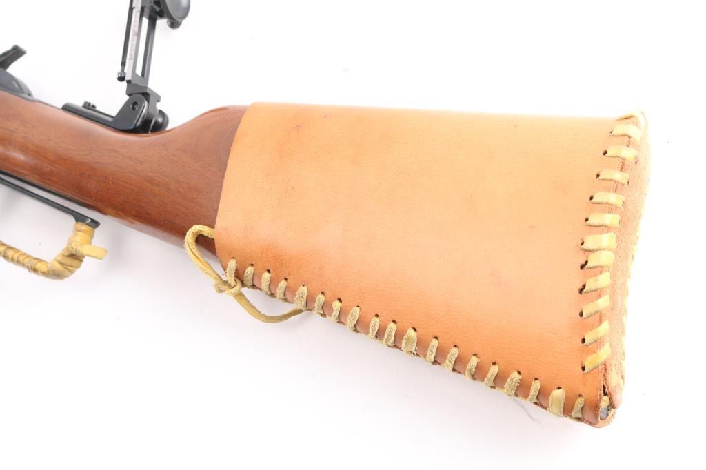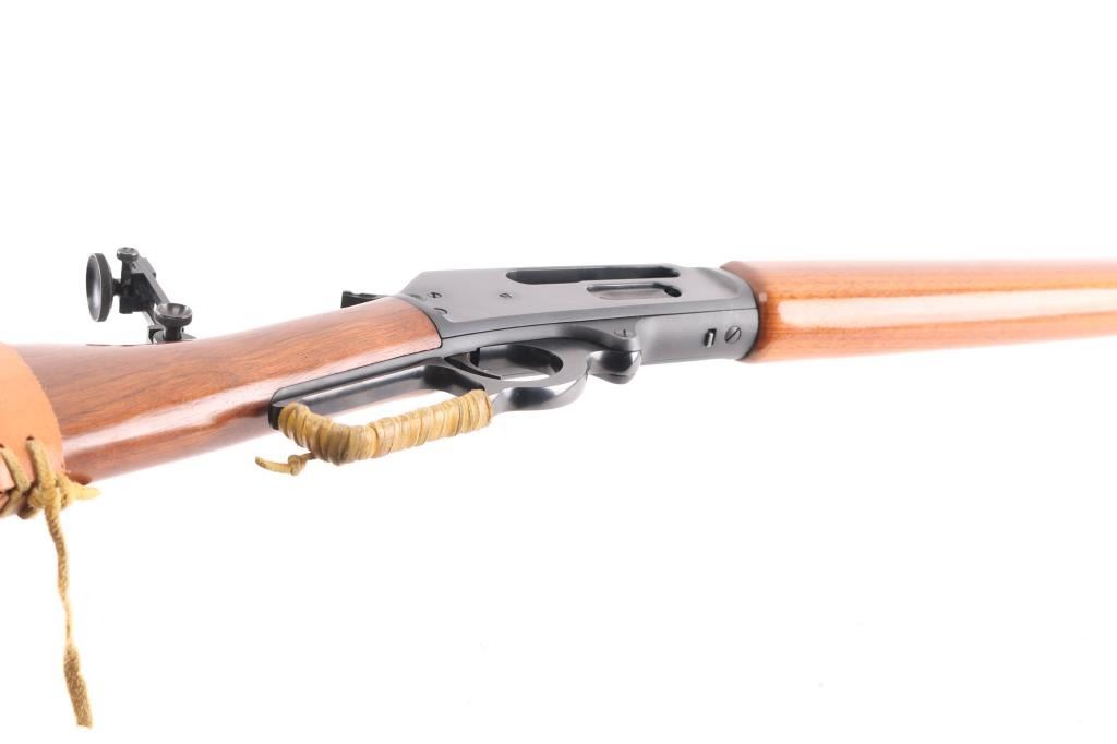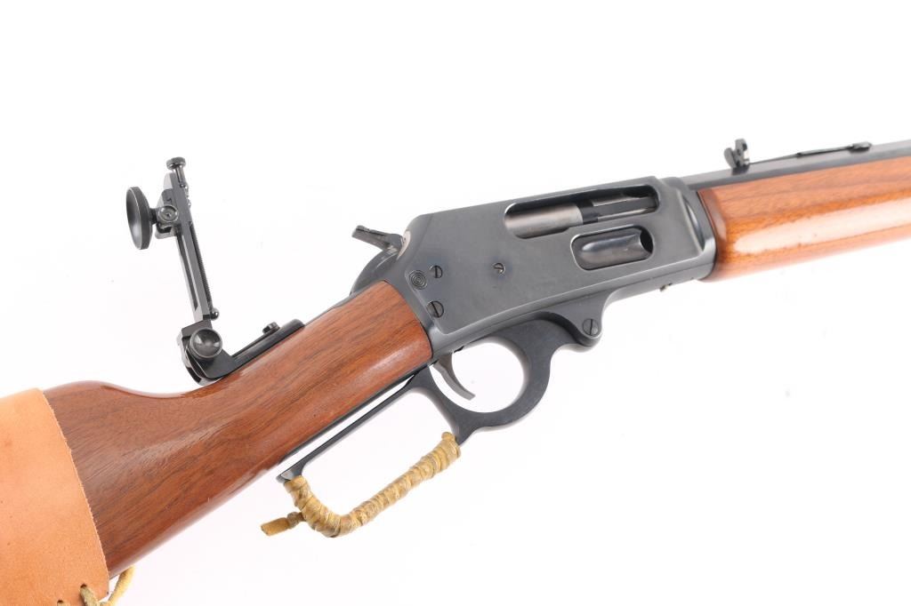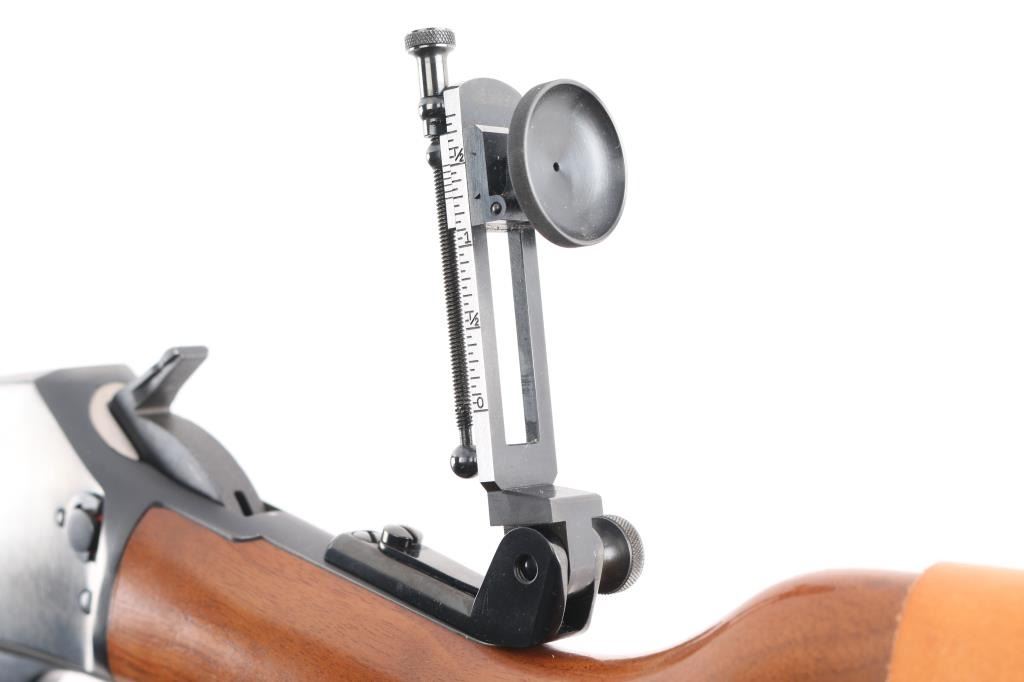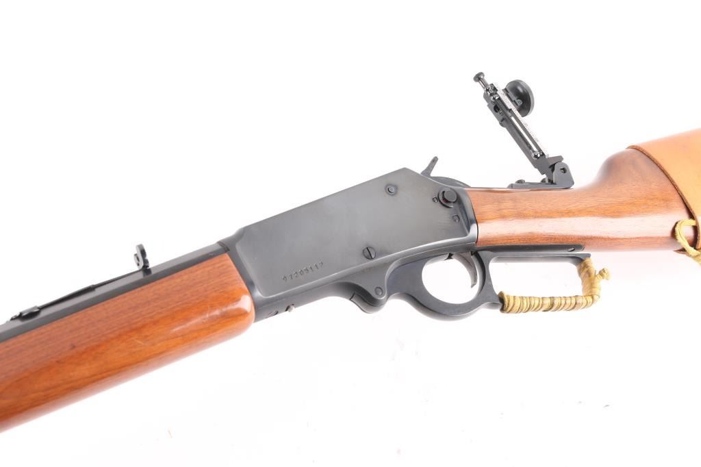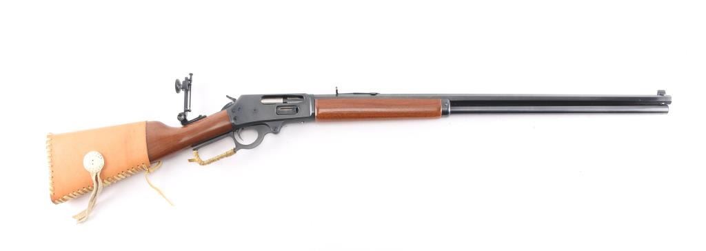 American made lever action repeating rifle chambered in .45-70 Government. Features a blued finish, "JM" stamped 26" octagonal barrel, full length 9-shot tubular magazine, large dovetailed blade front sight with brass bead, adjustable folding leaf rear sight, factory drilled & tapped steel receiver, smooth trigger, serrated hammer spur, push button cross-bolt safety, grip safety, checkered American walnut forend with metal cap, and straight grip shoulder stock. Brown leather sleeve with concho attached to the buttstock, & lever. Rifle exhibits approximately 98% of it's original finish showing only light handling marks with no major wear observed. Action is smooth, the bore is excellent and the wood stocks are fine. A adjustable peep sight with eye cup attached to the tang.