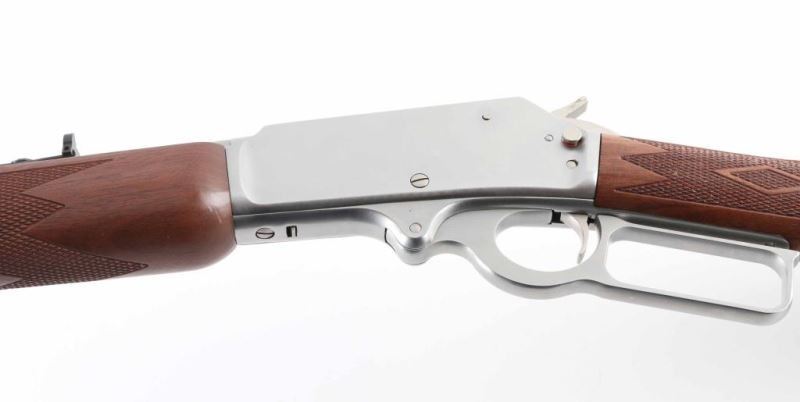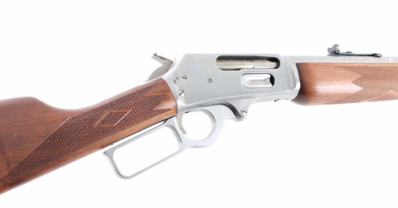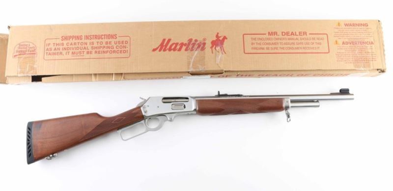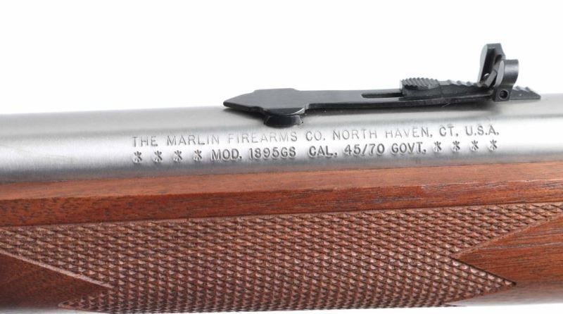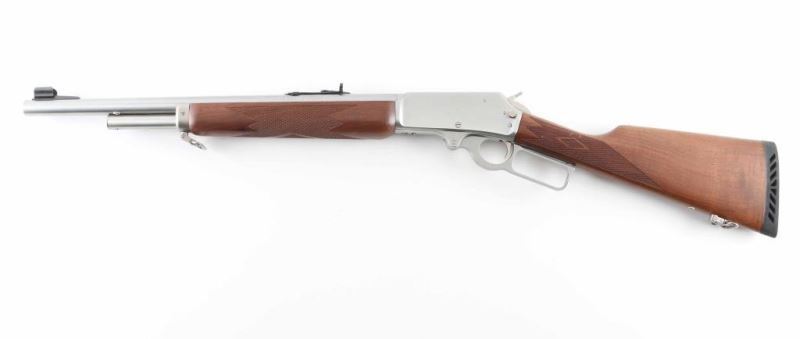 ‘Guide Stainless’ Stainless steel lever action repeating rifle chambered in .45-70 Government, manufactured in North Haven, CT circa 2004. Features a satin stainless finish, 18.5" “JM” marked barrel, 4 round tube magazine, ramped & hooded blade front sight with brass bead, elevation adjustable semi-buckhorn rear sporting sight, smooth trigger, serrated hammer spur, factory drilled & tapped receiver, cross-bolt safety, grip safety, quick-detach sling swivels, point checkered walnut semi-beavertail forend with metal cap and straight grip shoulder stock with inlayed bullseye, factory recoil pad & 13 3/8” LOP. Includes the original factory cardboard box. Rifle exhibits some bright superficial scratches with no major wear observed. Action is smooth, the bore is pristine and the wood stocks are excellent. Condition is near NRA Excellent. ***Modern Firearm***