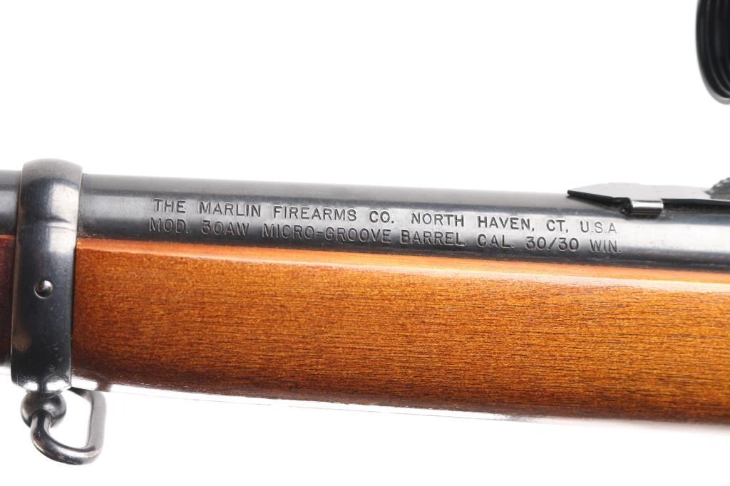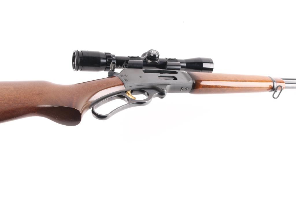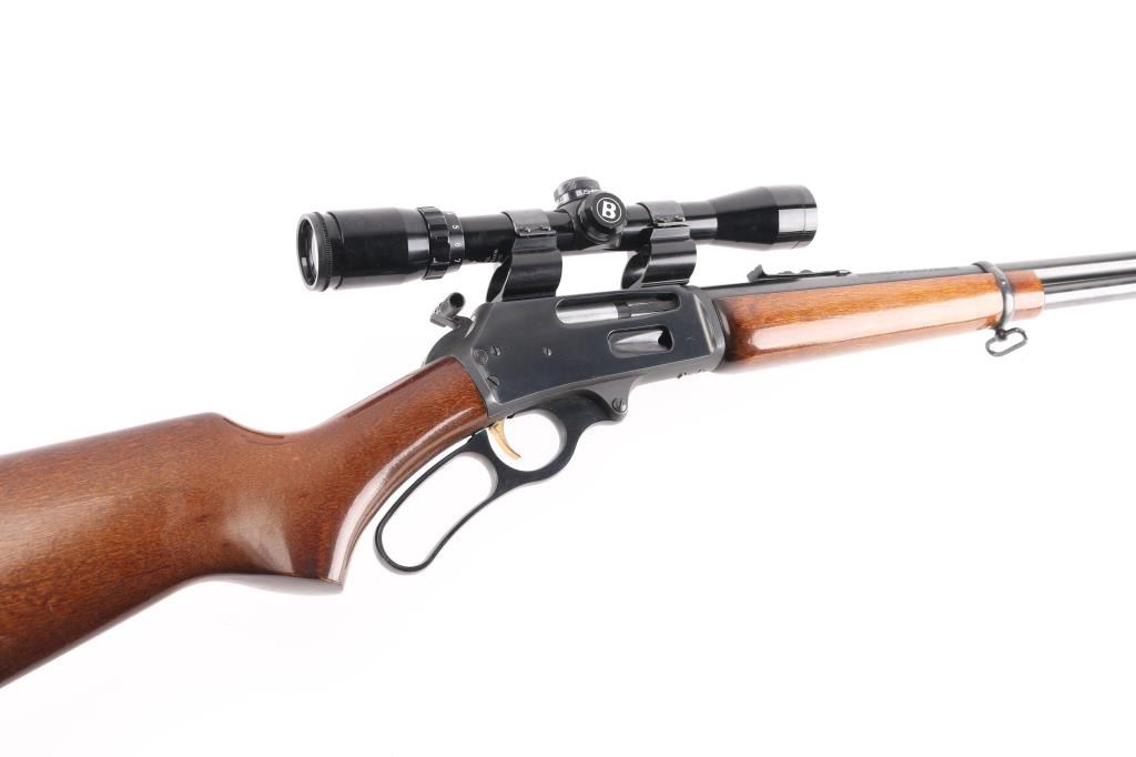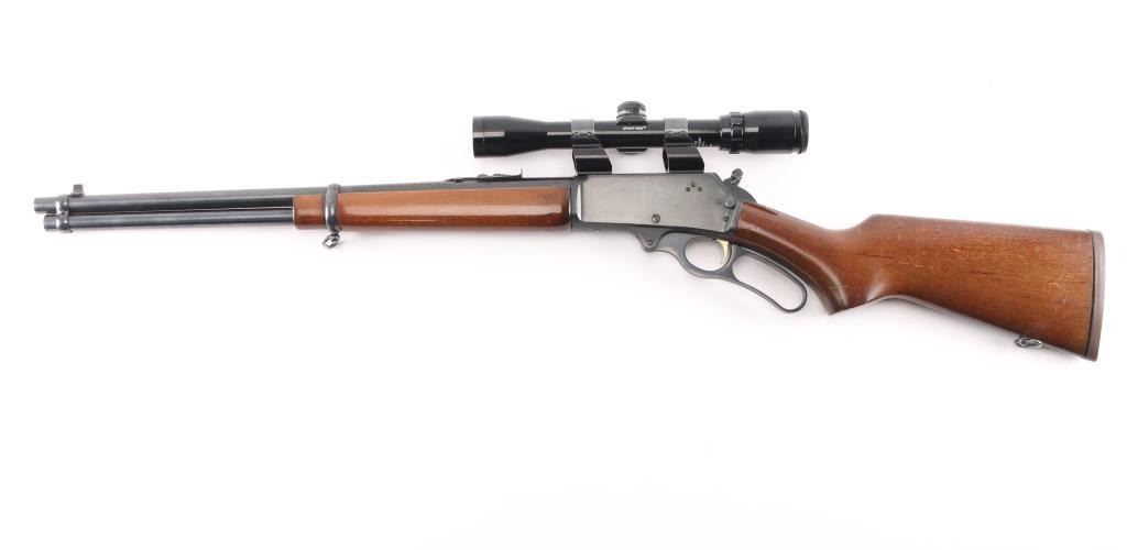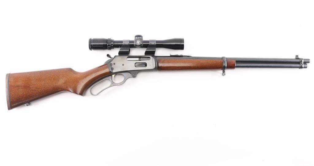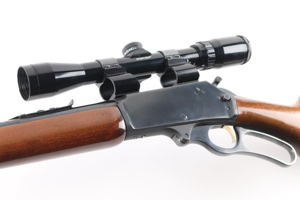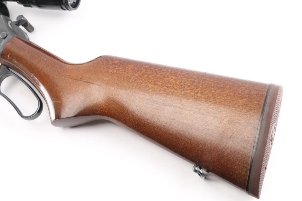 Manufactured 1989, has the JM stamp on the barrel. Lever-action carbine with 20" barrel, full length tube magazine,blade/bead front and rear sporting sights, hammer block safety, gold tone smooth trigger, factory rubber recoil pad, blued finish, sling swivels. 6 round capacity. Receiver drilled/tapped for optics. Mounted with a Bushnell 3X-9X, 32 Sportsview scope, fine crosshair reticle, clear optics, see through Weaver rings. Bore is excellent/bright, wood and finish are excellent.NRA condition-Excellent. Modern Firearm.