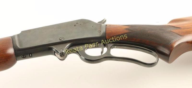 Vintage lever-action repeating rifle chambered in .32 Special, circa 1948-1960. Features a blued finish, 24" JM' marked barrel, 2/3 length tube magazine, ramped & hooded front sight, adjustable rear sporting sight, curved lever, smooth trigger, partially serrated hammer spur, swivel studs, metal forend cap, checkered walnut beavertail forend and semi-pistol grip shoulder stock with factory buttplate. Rifle retains approximately 65% of it's original finish with the majority of it's wear in the form of thinning on the barrel and on the flats of the receiver. Action is smooth, bore is excellent and wood stocks are good as the appear refinished & have a repaired chip to the left of the upper tang. Condition is good to very good. ***C&R Firearm*** ***Modern Firearm***