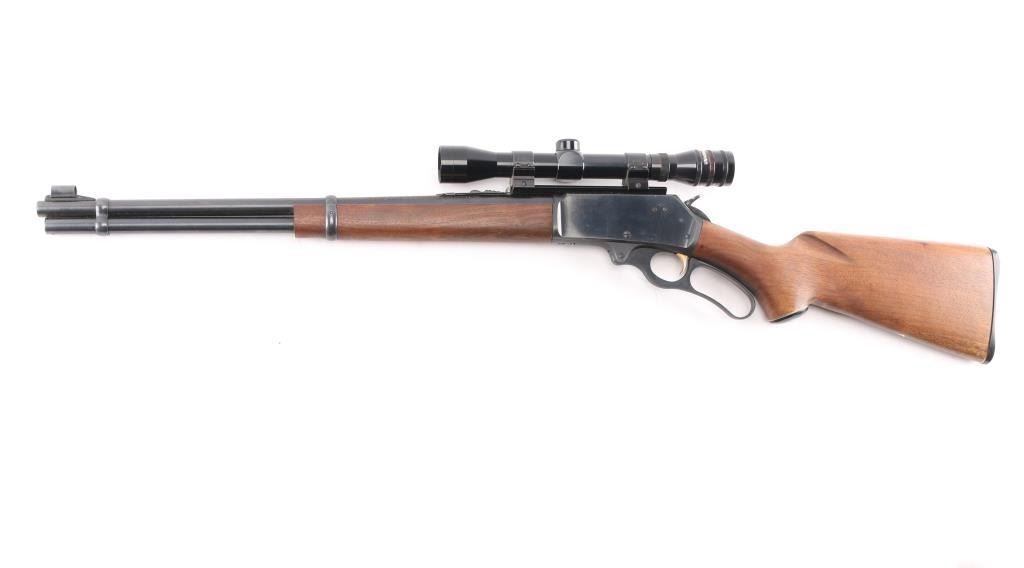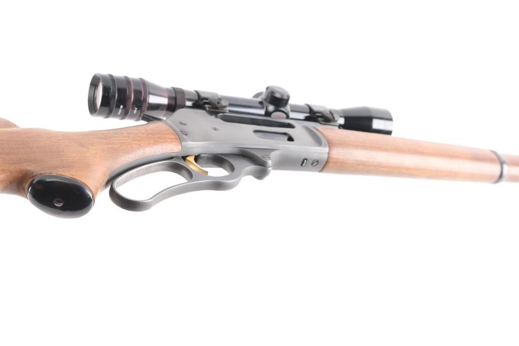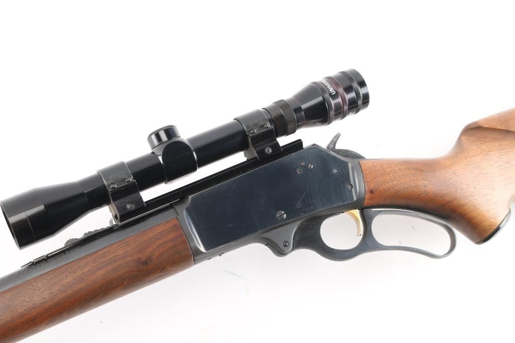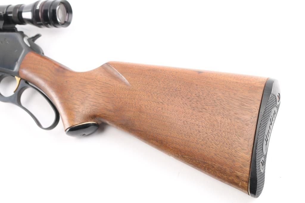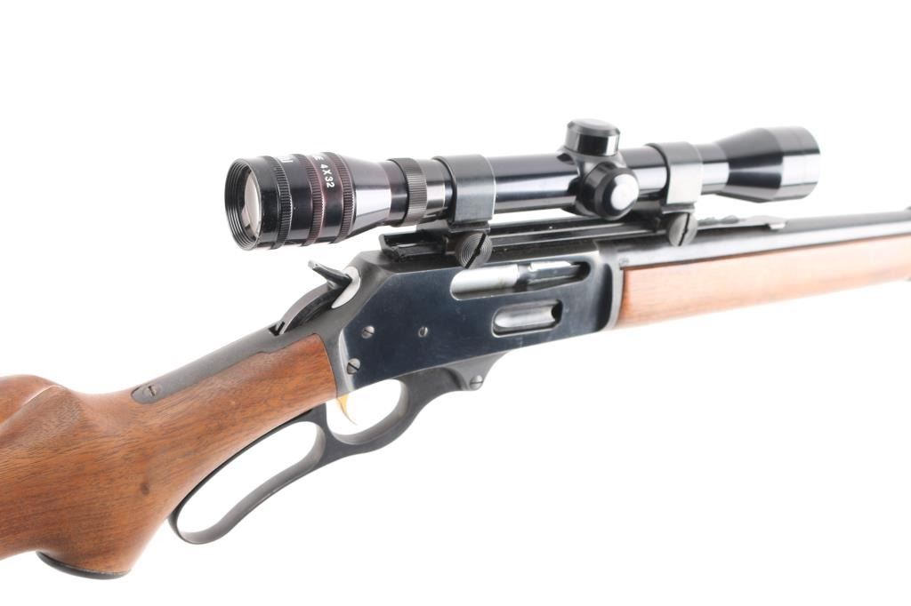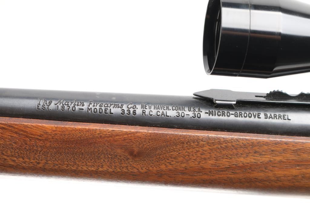 Vintage lever action repeating rifle chambered in 30-30, manufactured circa 1963. Features a blued finish, "JM" marked 20" round barrel, ramped & hooded blade front sight with bead top, elevation adjustable rear sporting sight, Universal UE 4X32 scope, full-length tube magazine, round bolt, smooth gold trigger, curved finger lever, grip safety, smooth walnut forend and pistol grip shoulder stock with black grip cap & factory plastic buttplate. Rifle exhibits approximately 95% of it's original finish showing scattered minor scratches, very minor edge wear. Action is smooth, the bore is excellent, optics are clear and the wood stocks are overall very good/sound with a little finish loss on the lower buttstock..