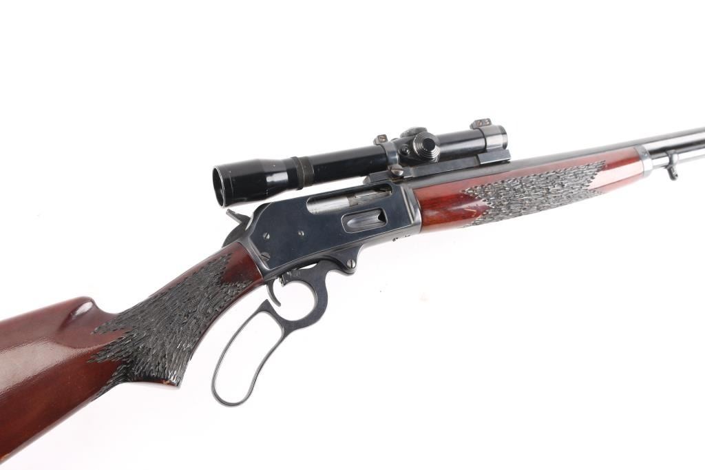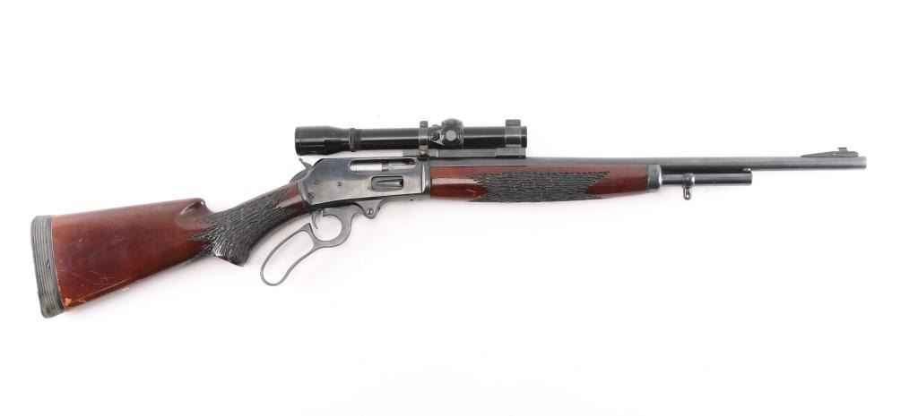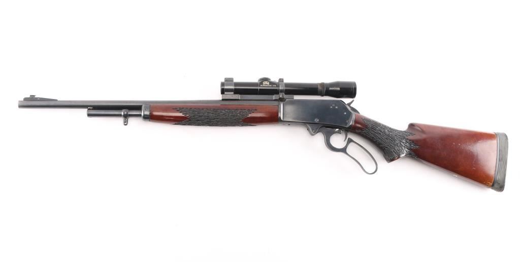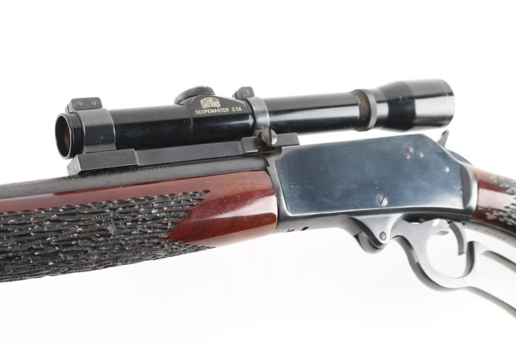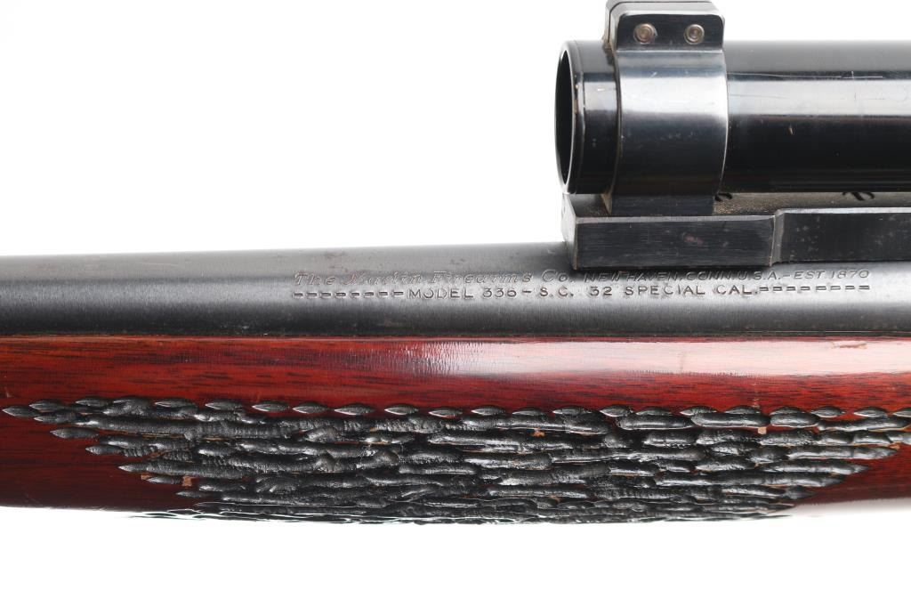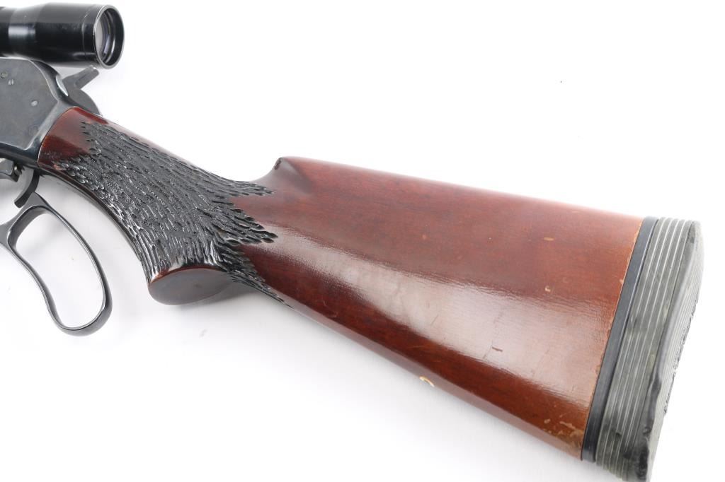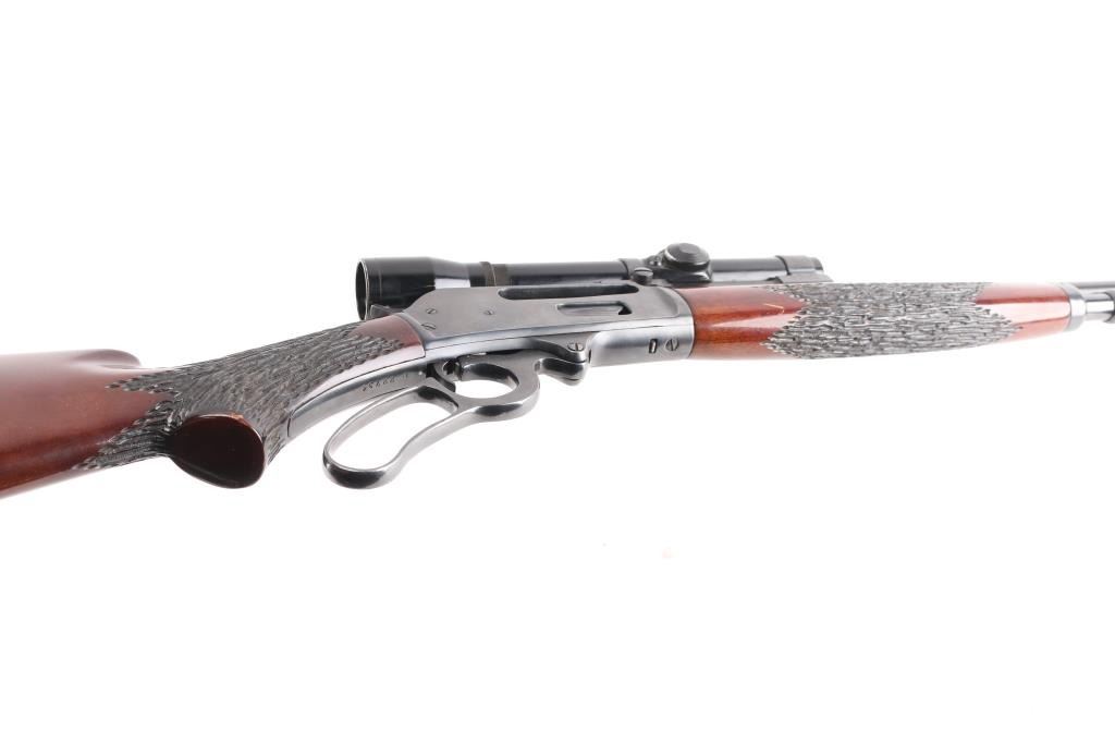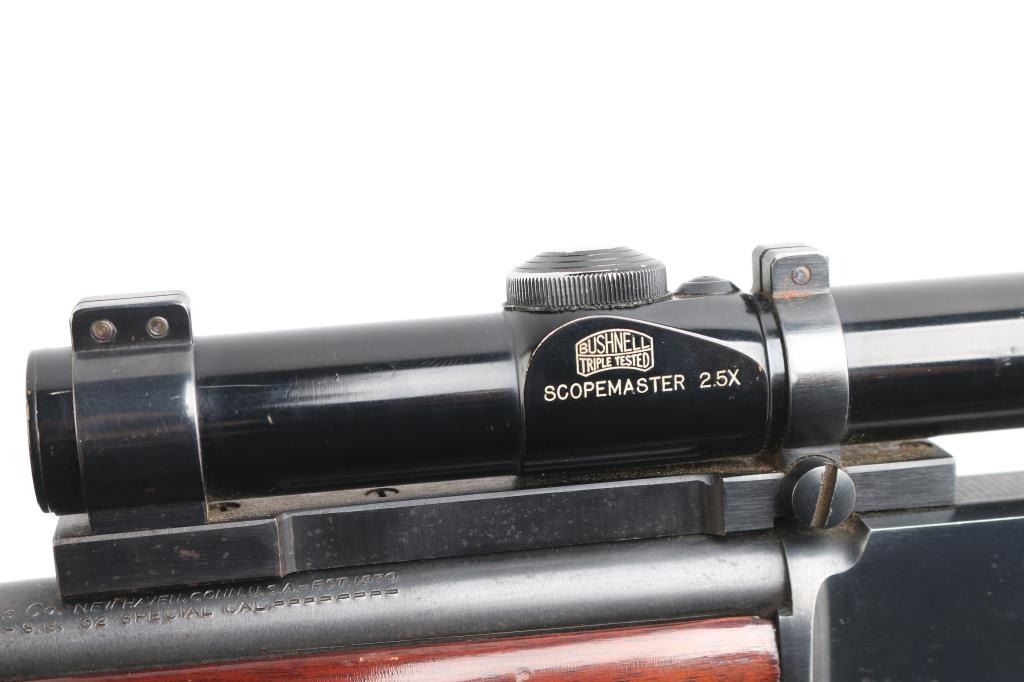 'Sporting Carbine'. Rare caliber. Vintage lever-action repeating rifle chambered in .32 Special, circa 1949. (F prefix). Features a blued finish, 20" 'JM' marked barrel, 2/3 length tube magazine, ramped blade/bead front sight, rear sight removed for scope, drilled & tapped receiver for a side mount sight, curved lever, smooth trigger, metal forend cap, sling swivel stud on magazine, walnut beavertail forend and semi-pistol grip shoulder stock with custom 'tree bark' craved in the grip and forearm, black rubber 'Limbsaver' recoil pad installed.. Mounted with a vintage Bushnell Scopemaster 2.5x scope, clear optics, fine crosshair reticle. Rifle retains approximately 90% of it's original blued finish showing light wear on the receiver from carrying, small losses/handling wear and some very light spots of pitting on the receiver, barely noticeable. Action is smooth, bore is very good/bright and wood stocks are good/sound with some chips/finish loss on the buttstock.