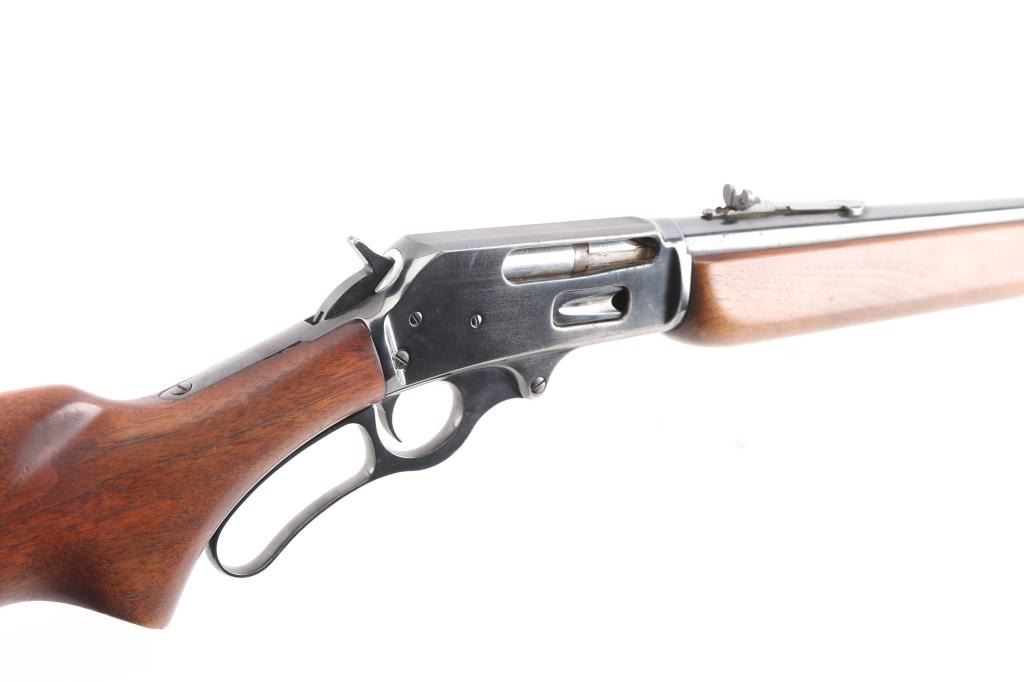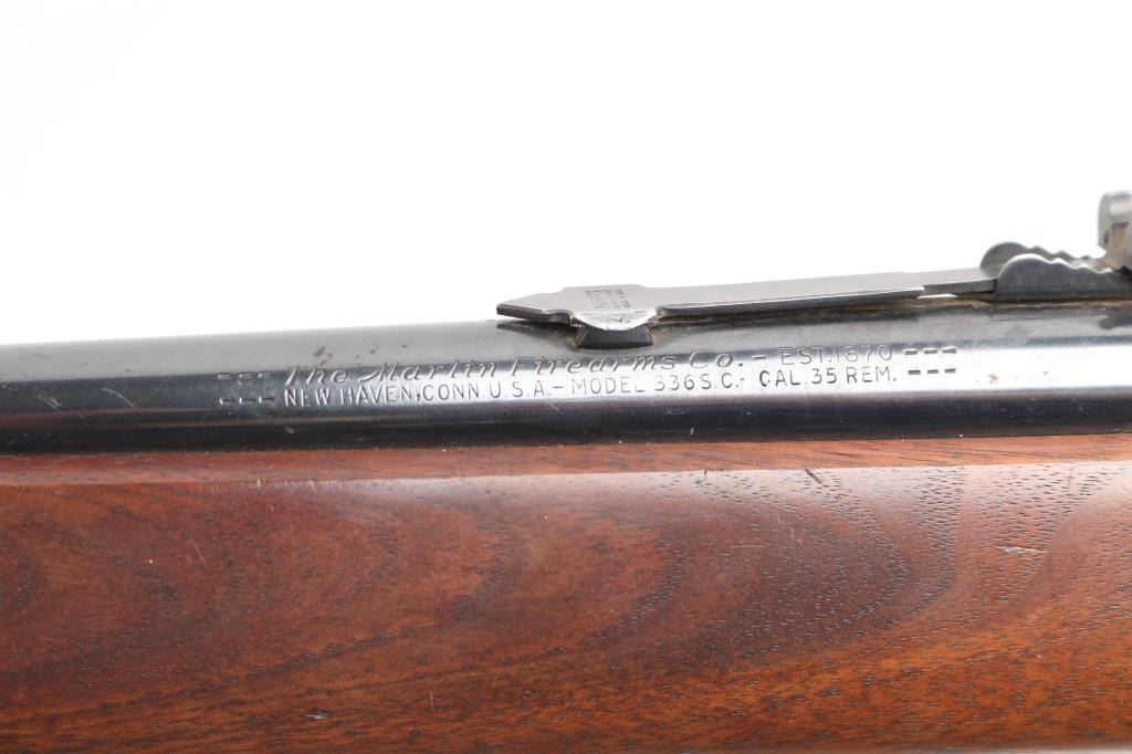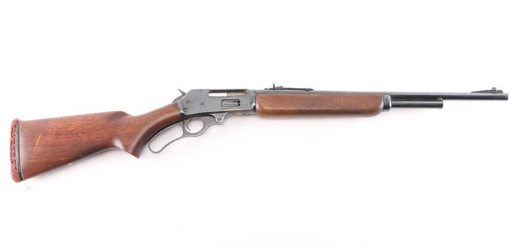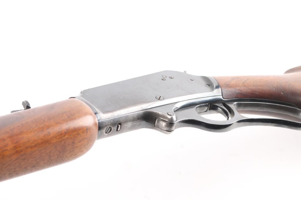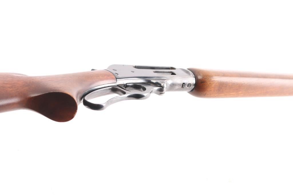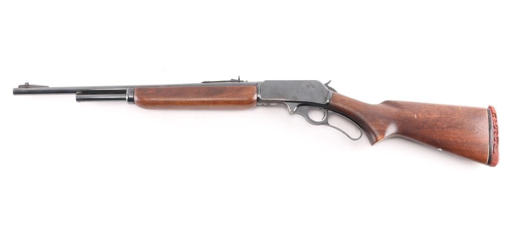 American lever action 'sporting carbine' chambered in .35 Remington. Features a fully blued finish, 20" barrel 3/4 tube magazine, ramped Marbles blade/bead front, and Marbles semi-buckhorn rear sights, partially serrated hammer spur, smooth trigger, plain wood forend with metal cap and pistol grip shoulder stock with rubber recoil pad. Rifle retains approximately 85% of it's blued finish with handling wear under the receiver and some minor scratches/rubs, edge wear. Action is smooth, bore is excellent and wood stocks are very good/sound with few minor scratches. The recoil pad is dry, cracked, needs replacement. Manufactured 1952.