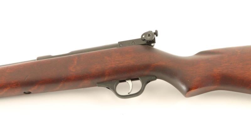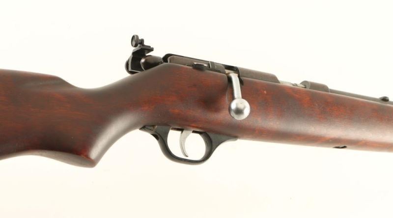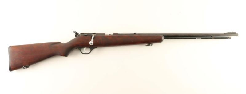 American made bolt action sporting rifle chambered for .22 Short, Long or Long Rifle, manufactured pre-1968. Features a blued finish, 24" barrel, full-length tube magazine, ramped blade front sight with brass bead, adjustable receiver mounted aperture sight, smooth trigger, plastic trigger guard, manual safety and smooth pistol grip shoulder stock with sling swivels & serrated hard rubber buttplate. Rifle retains finish primarily on the magazine tube with the balance on the metal surfaces turned to a nicely ages brown patina. Action is smooth, bore is excellent and the wood stock is very good but is missing the bullseye. Condition is NRA good. ***C&R Firearm***