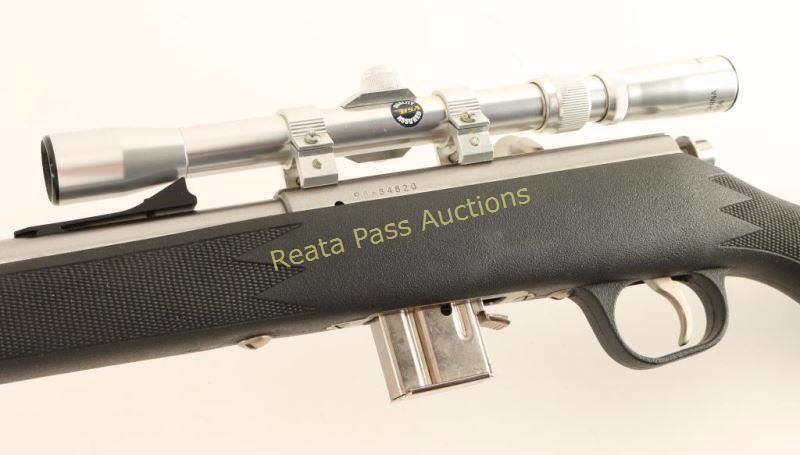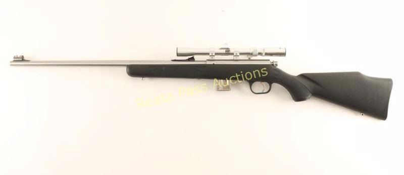 Stainless steel magazine-fed bolt action sporting rifle chambered in .22 Winchester Magnum. Features a brushed finish, 22" barrel, adjustable fiber-optic sights, BSA 3-7x 20mm scope, 7 round detachable magazine, serrated trigger, manual safety, bent bolt handle, swivel studs and checkered one-piece black synthetic pistol grip shoulder stock with high comb. Rifle exhibits light handling marks with no major wear observed. Action is sound, bore is excellent and synthetic stock is fine. Condition is near excellent. ***Modern Firearm***