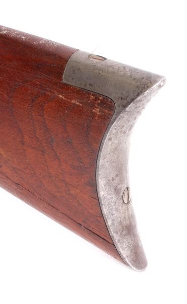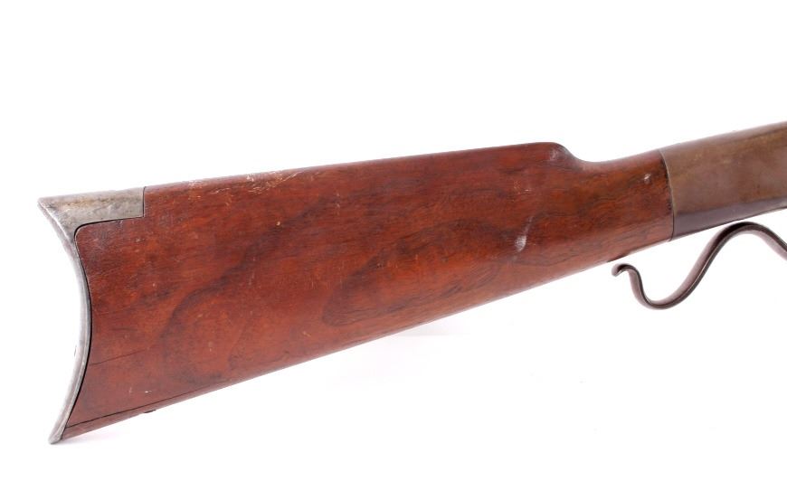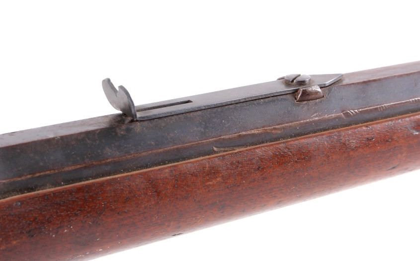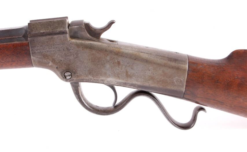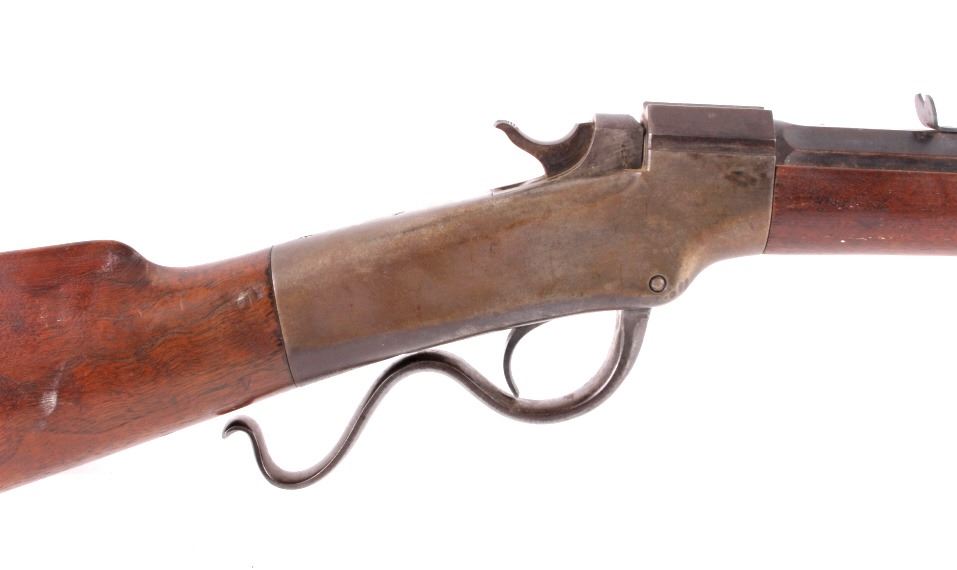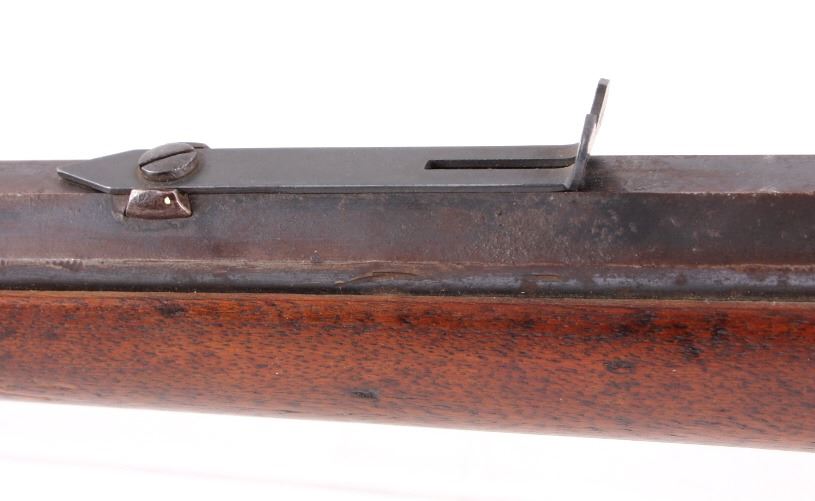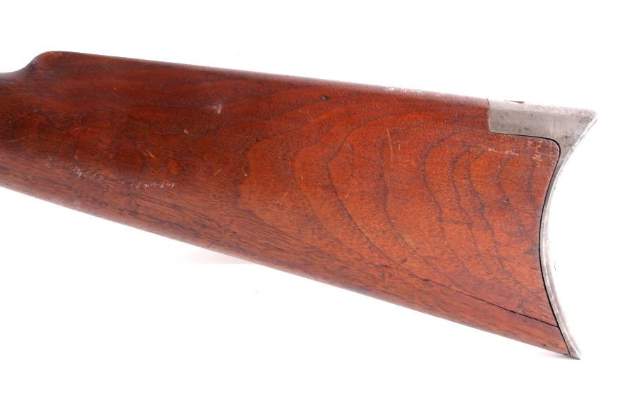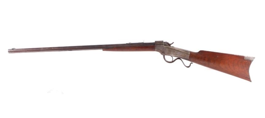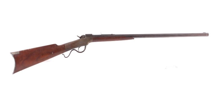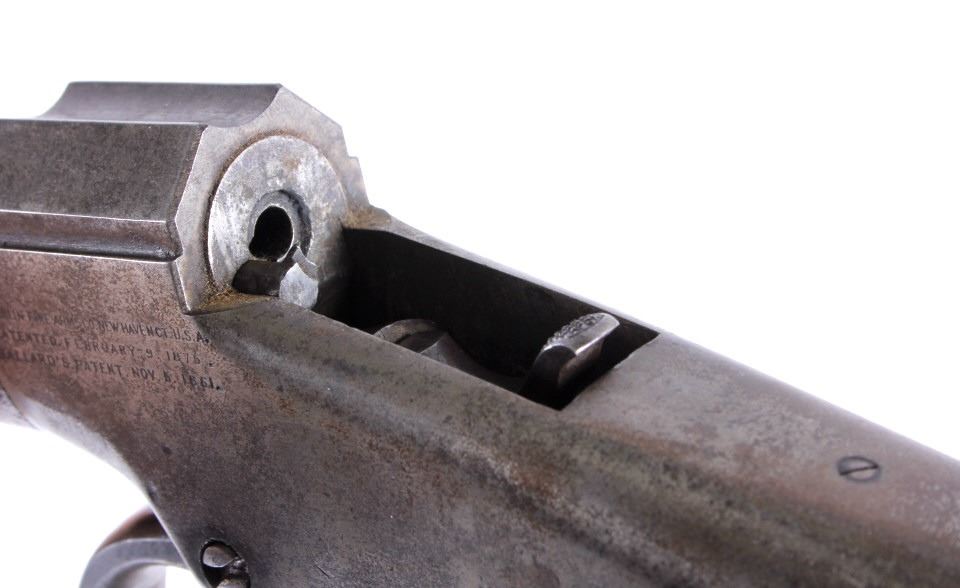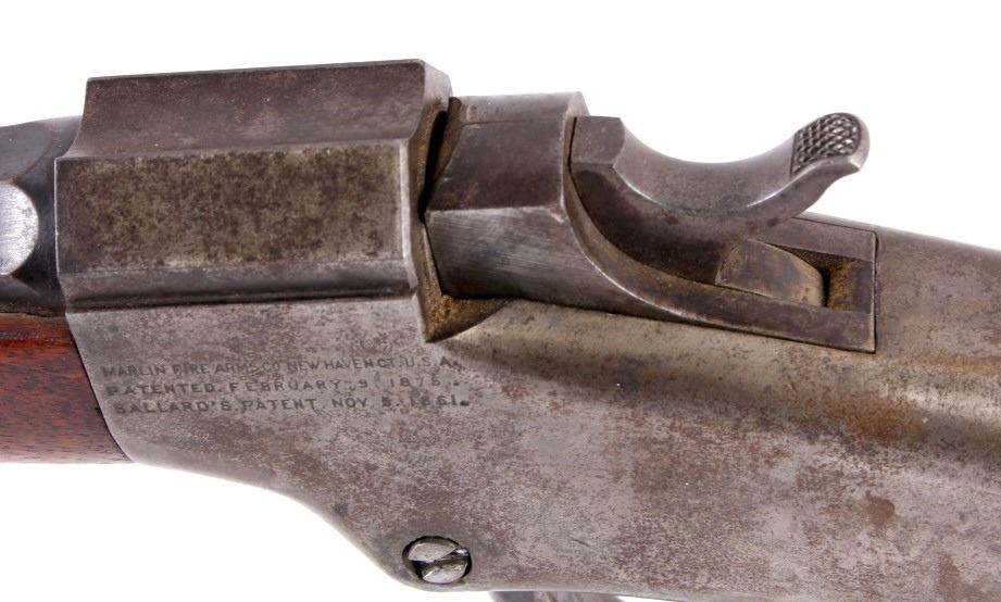 This is a scarce Ballard single shot .22 caliber rifle manufactured by Marlin Fire Arms Company. The rifle features open sporting sights on a rifled octagon barrel with solid walnut hardwood stocks and a lever actuated falling block action. The receiver is marked "Marlin Fire Arms Co. New Haven Ct. U.S.A. / Patented February 9, 1875 / Ballard's Patent Nov 5, 1861". The Marlin Ballard rifle is in good overall condition. It measures 41.5" long. Serial number is 31580. This is an antique rifle manufactured before 1898 and requires NO FFL.