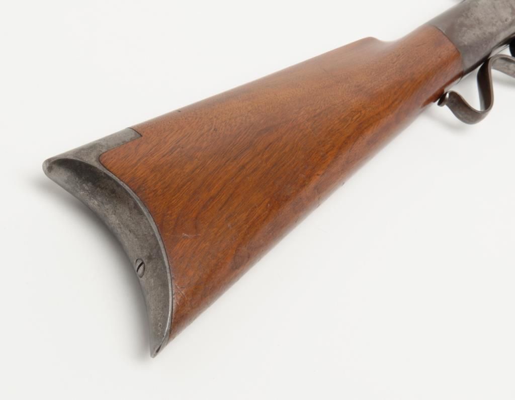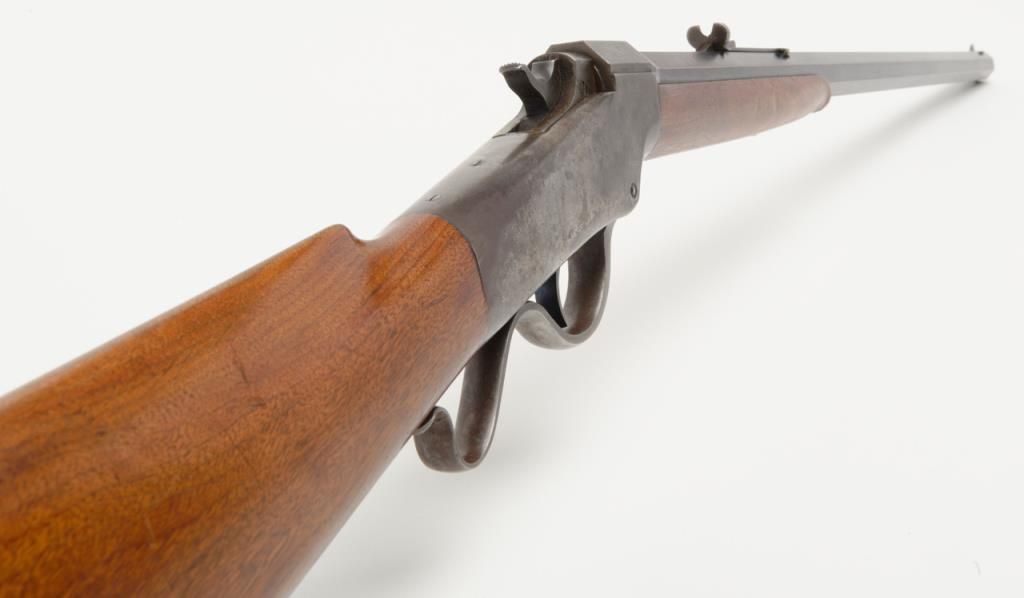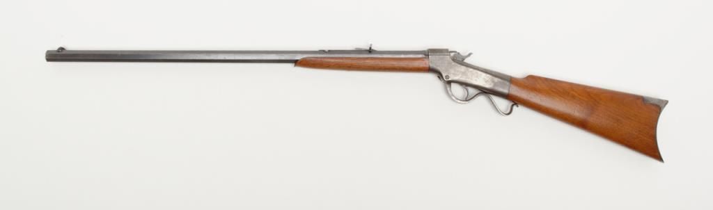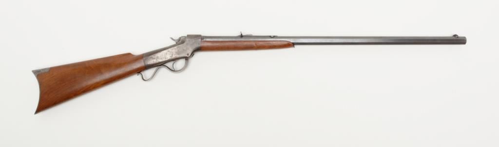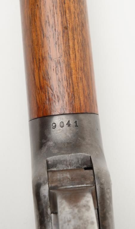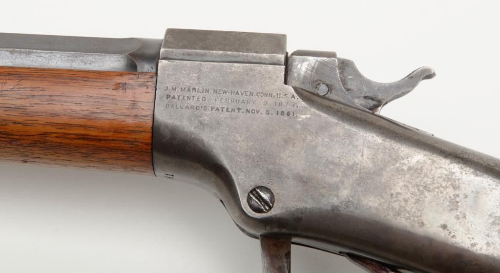 Marlin-Ballard Single Shot rifle, .32 Long cal., 28” octagon barrel, blue and case hardened finish, wood stocks, #9041 in overall very good + condition showing the majority of its original blue finish on the barrel and considerableoriginal case colors on the receiver; very good bore, crisp action, sharp markings and very good wood butt stock and forend with ebony insert. (Antique). Est.: $700-$1,400.