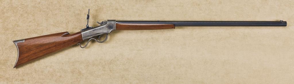 Marlin Ballard number 4 “Perfection”, .32-40 caliber rifle, 30” octagon barrel, blue and case hardened finish, standard varnish stocks 26904. The rifle remains in orig. near fine condition showing 90-95% original blue on barrel thinning at high points and edges, some light erosion and normal aging just starting. The frame shows 50-70% original case hardening, drifting to light silvery grey, but still rainbow colors showing over the entire surface with some areas of bright colors mixed in. The rifle is mounted with a mid-range vernier type tang sight. There is a blank in the rear dove tail and a beech front sight. The rifle shows a medium weight octagon barrel, and the varnish wood stocks are very good plus with approx. 75-85% original varnish, some minor marks and even losses. The butt plate shows traces of case hardening with some minor erosion and pinprick pitting. The action is good, the bore is near excellent. Pictured in Ballard, The Great American Single Shot Rifle by John Dutcher. Est.: $1,000-$2,000