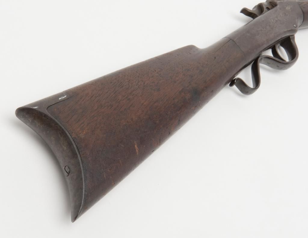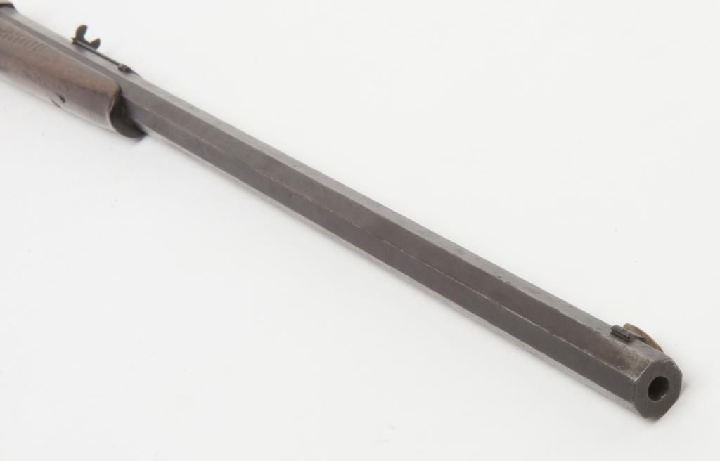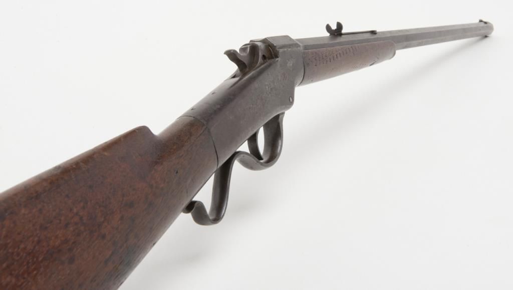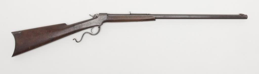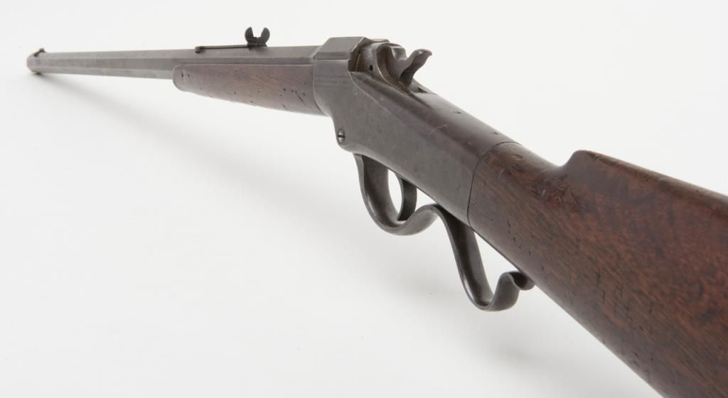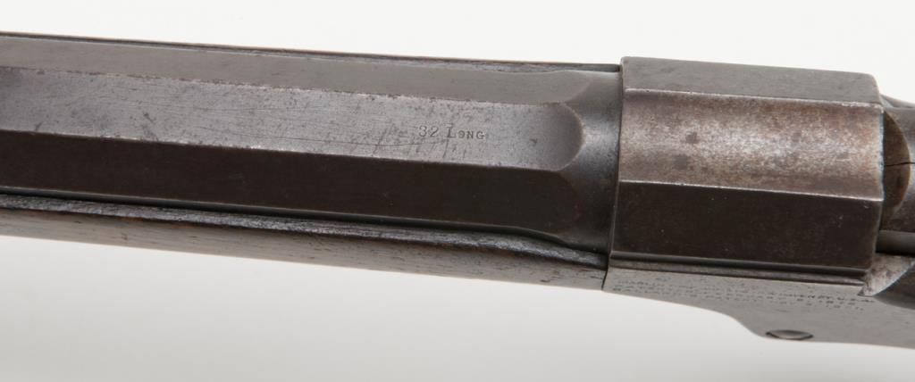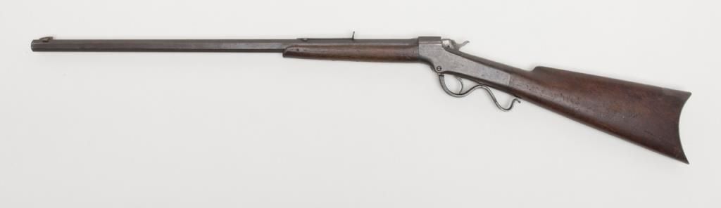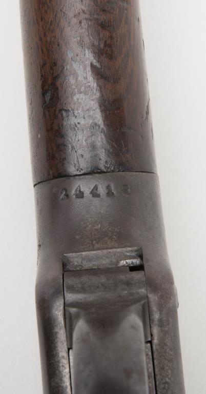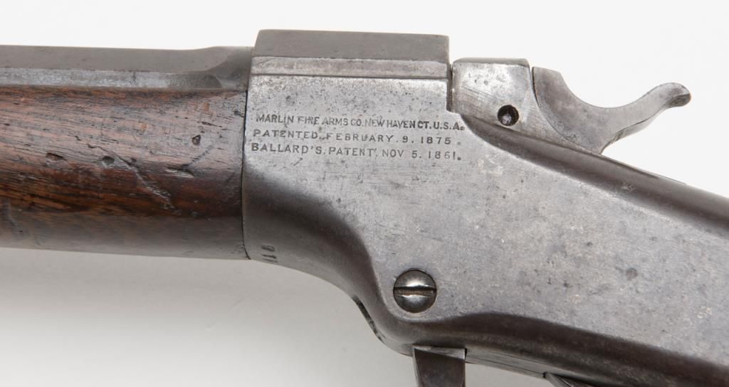Marlin Ballard single shot rifle, cal. .32 Long, Serial #24418. The rifle is in overall good to very good condition with a 26” octagonal barrel. The barrel has gone to a pleasing plum patina with a silver blade front sight and buckhorn rearsight, which is missing the elevator. The action is patina as well with some light surface erosion. The smooth wood stocks are in good condition with small mars, compressions and dents consistent with use. The butt stock ends in a metal,crescent butt plate. The bore is fair, action tight and markings crisp on this Marlin. (Antique). Est.: $600-$1,200.