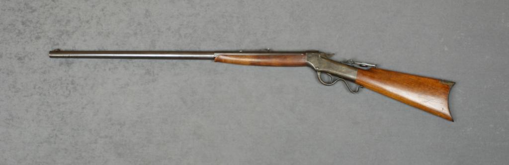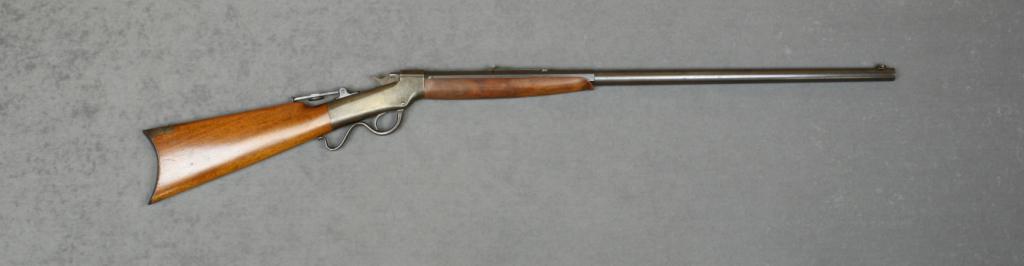 Marlin Ballard single shot target rifle,  .38-55 cal., 30” half round/half octagon  barrel, blue and case hardened finish, wood  stocks, #29161. This gun is in overall fine  condition showing approx. 75% muted originalblue finish to barrel, approx. 65% original  case colors on frame, bore should clean to  fine, crisp action and markings, adjustable  vernier tang sight, flip-up Beech’s gold wash  front sight and standard rear sight; wood is overall fine with some storage mars and  scratches; case colors have gone to silvery  finish on crescent butt plate.  A really  desirable Marlin Ballard in the right  caliber.  Est.:  $1,500-$3,000.