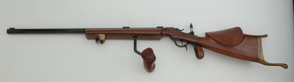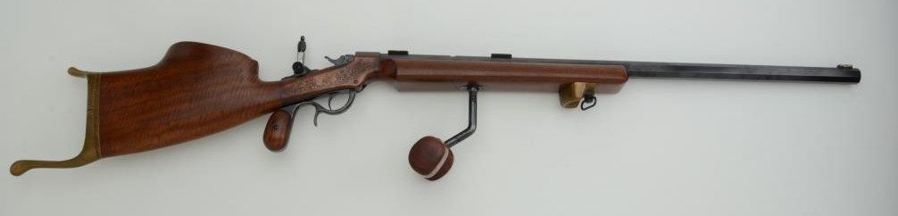 Marlin Ballard single shot target rifle custom built by Gilkey with palm rest, .22LR cal., 29-1/2” Winchester octagon barrel, re-blue finish to barrel, custom engraved and browned finish to receiver, custom targetdeluxe finely grained wood stocks with Schutzen-style brass butt plate, #7438. This highly customized rifle is in overall fine condition with a fine bore, crisp action, beautiful custom wood stocks, adjustableParker-Hale tang sight, full length scope mounts and matching wood palm rest and lever grip knob. Est.: $1,500-$3,000.