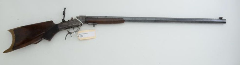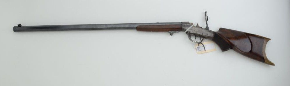 Marlin Ballard single shot target rifle with Winchester heavy octagon barrel, 32”, blue finish, double set triggers, wood stocks, brass Schutzen butt plate, #19467, adjustable tang and adjustable front sight. This gun is in overall very good condition with the majority of its original blue on the barrel and traces of silvery toning on the receiver, fine bore, crisp action and double set triggers working at time of description; very good wood stocks with fine checkering on the butt stock and some scattered mars and scratches from storage. Est.: $1,000-$2,000.