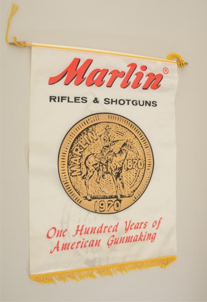 Marlin Firearms advertising banner commemorating 100 years of service, approx. 28” x 20” overall in very good condition in factory cardboard shipping box; likely for use in a gun shop; a great decorator. Est.: $75-$150.