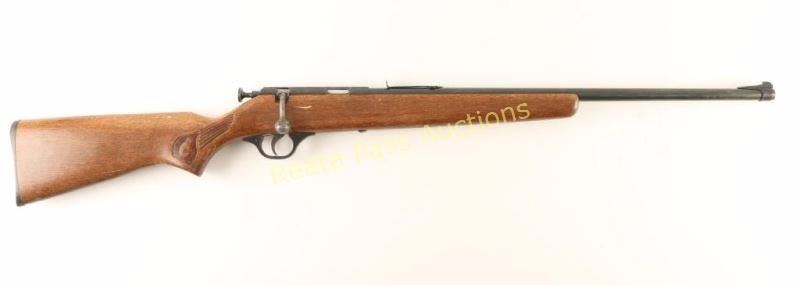 Single shot bolt-action sporting rifle chambered in .22 Short, Long or Long Rifle. Features a blued finish, 22" barrel, ramped blade front sight, rear sporting sight(missing ramp), integral scope rail scope cut into the receiver, serrated trigger, manual cocking system, and one-piece smooth wood pistol grip shoulder stock. Rifle exhibits approximately 65% of it's blued finish overall showing a browning patina & some rust/pitting. Action is sound, bore is excellent and wood stock is fair to good. Condition is good. ***Modern Firearm***