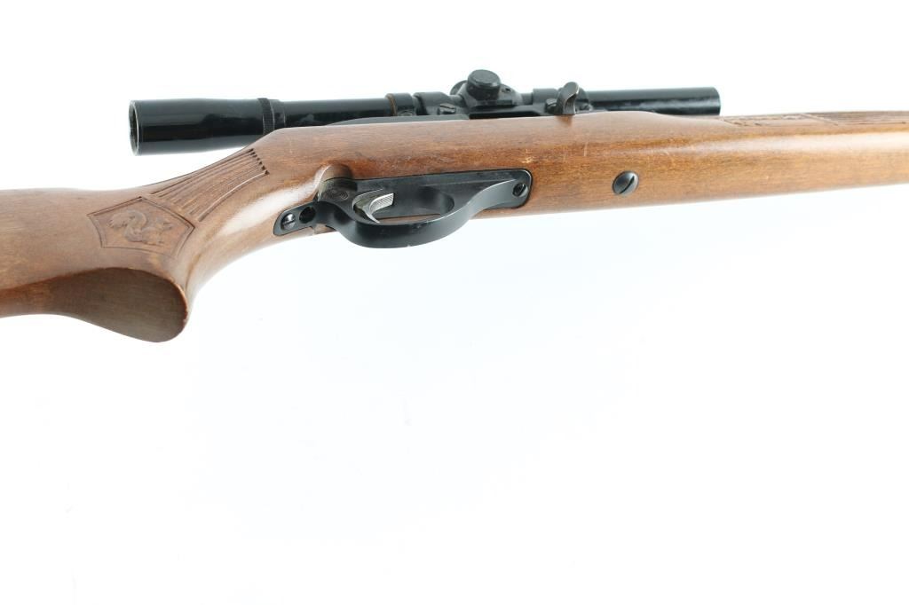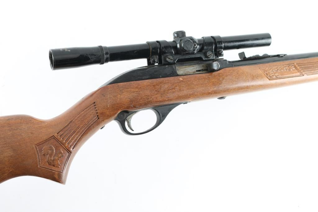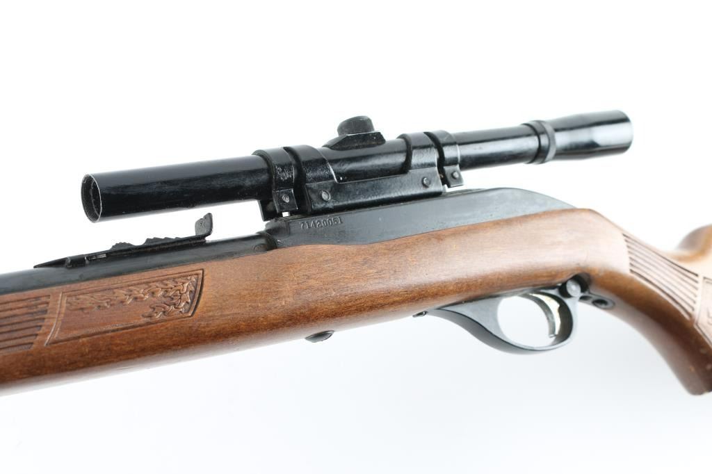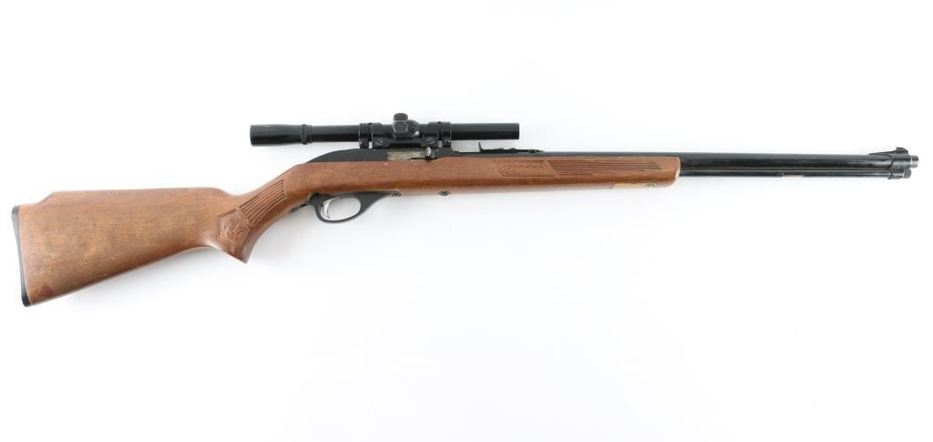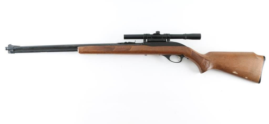 Semiautomatic rimfire rifle for 22 long rifle only. Features blued finish, wood stock with impressed grasping grooves and decorations, black plastic buttplate, 22" barrel, full length magazine tube under barrel, blade front & sporting rear sights, grooved receiver, manual bolt hold open, push button safety. Bore is good condition, might improve with cleaning. Metal has been re-blued, there is a line of surface rust on the barrel where it meets the magazine. Stock is good with some scratches/scuffs. Mounts a Glenfield 4x15 scope with clear optics. Metal/scope have dried cosmoline and needs a good cleaning. NRA Condition-Good/Re-Blued. Modern firearm.