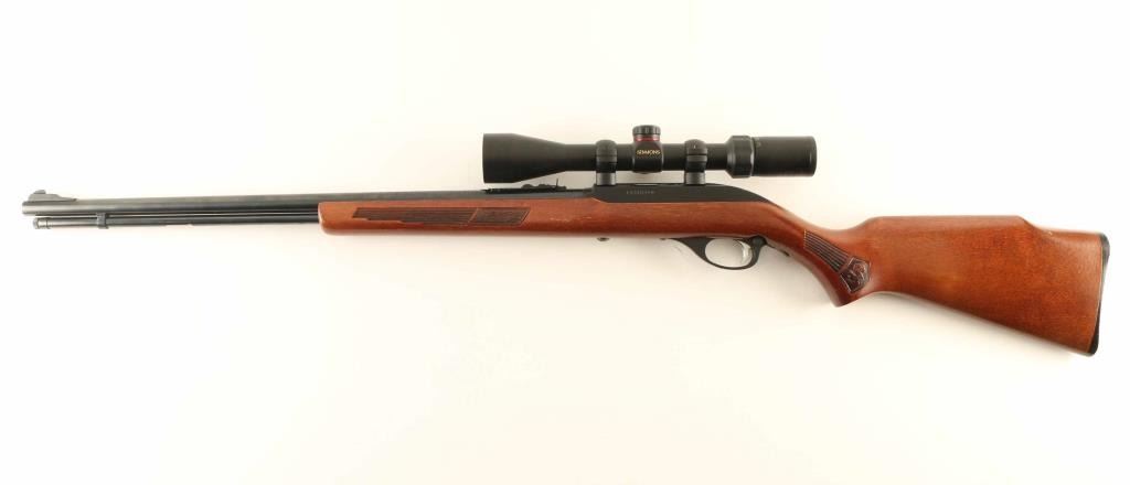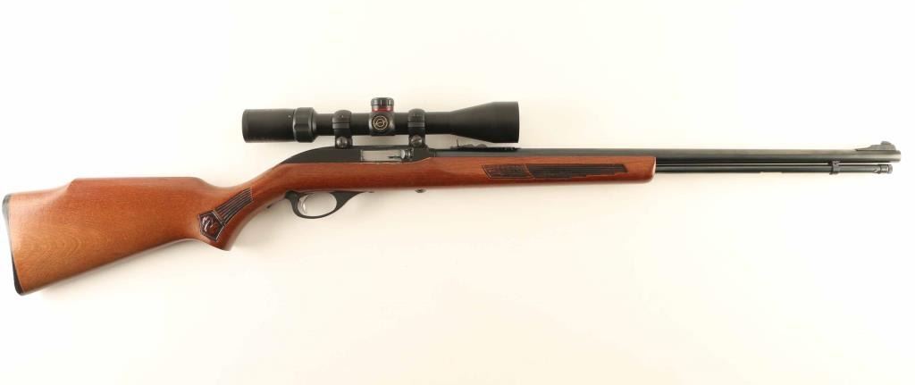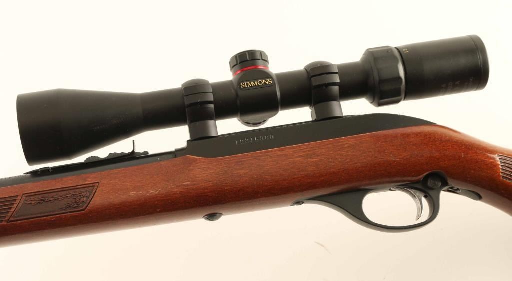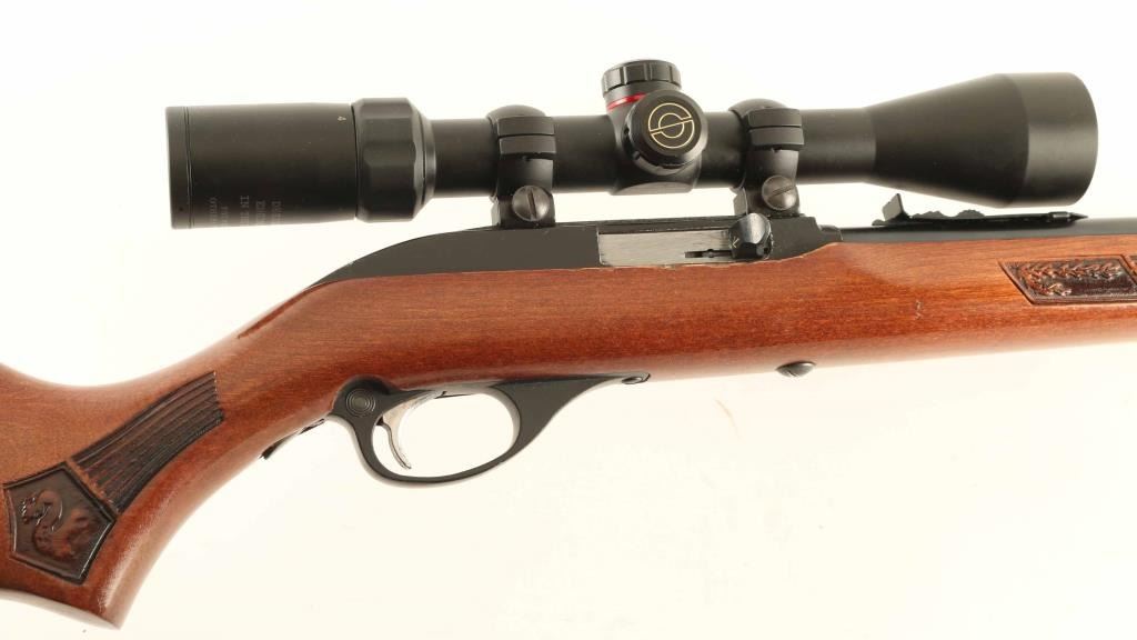 American made tube fed semi-automatic sporting rifle chambered in .22 Long Rifle, manufactured circa 1960-1980’s. Features a blued/black finish, 22" "JM" marked barrel, full-length 17 round tube magazine, ramped blade front sight, elevation adjustable rear sporting sight, Simmons 8-Point 4-12x 40mm scope mounted using the integral scope rail cuts in the aluminum receiver, serrated nickel plated trigger, alloy trigger guard, push button safety, and birch semi-pistol grip shoulder stock with press textured grip panels, high comb, & checkered black buttplate. Rifle exhibits approximately 95% of its original finish showing light handling marks, some wear on the optic rail and finish loss around the ejection port. Action is sound though the push-in bolt hold open is non-functional, the micro-groove bore is very good and the wood stock is very good with blemishes. Condition is NRA Very Good. ***Modern Firearm***