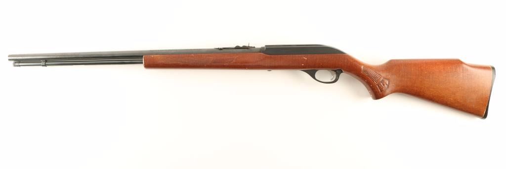 Tube-fed semi-automatic sporting rifle chambered in .22 Long Rifle. Features a blued 22" barrel, full tube magazine, no front sight, adjustable rear sporting sight, serrated trigger, push button safety, and one piece pressed wood pistol grip shoulder stock with high comb. Barrel & bolt show scattered heavy surface rust and black finished receiver shows wear along the integral scope rail. Action is sound, bore is excellent and wood stock is good+ with numerous small nicks. Condition is fair to good. ***Modern Firearm***
