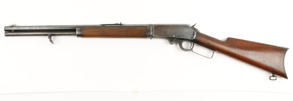 Lever action takedown short rifle made in 1902 with 20" octagon barrel. Blued finish, plain straight grip walnut stock, capped forearm, crescent butt plate, full length magazine, blade front sight, buckhorn rear sight and sling swivel. Good bore and action. Condition: Good overall showing light pitting, good patina and wood is good.