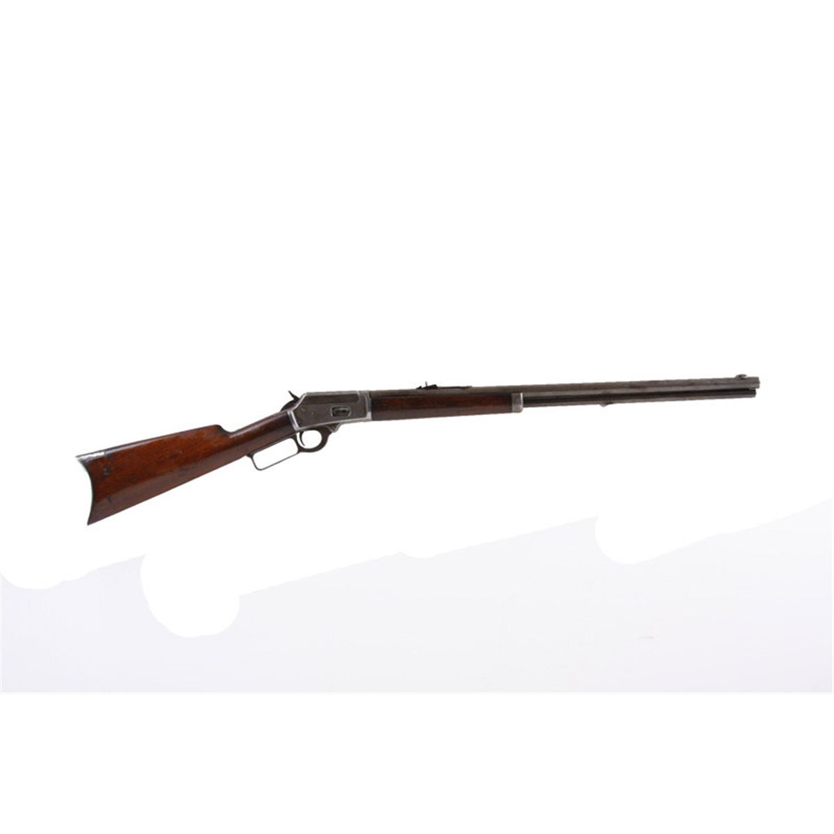 Marlin Mdl 1894 Cal .357 SN:215848 Lever action repeating rifle. Blued finish with case color receiver, smooth wood stock with crescent butt plate and smooth wood forearm with metal cap, 24" round barrel with full length magazine and semi-buckhorn adjLever action repeating rifle. Blued finish with case color receiver, smooth wood stock with crescent butt plate and smooth wood forearm with metal cap, 24" round barrel with full length magazine and semi-buckhornadjustable rear sight, good bore and action. Condition: Very good with 25% of the finish remaining. Barrel shows some surface rust near the muzzle. Wood is very good and has probably been refinished. Originally .25-20 but rechambered to .357. Check chambering before firing