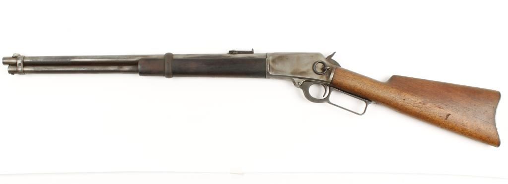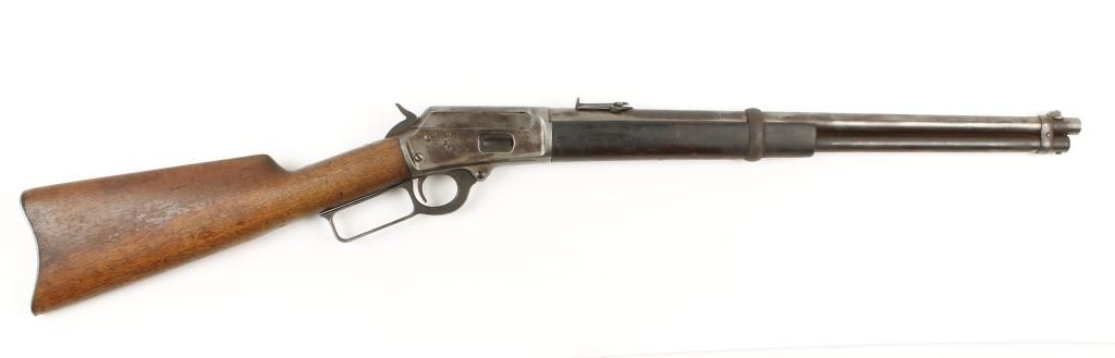 Lever action carbine made in 1903 with 20" barrel. Blued finish, plain straight grip walnut stock, capped forearm, crescent butt plate, full length magazine, saddle ring and flip up rear sight. Dark bore and good action. Condition: Fair showing little finish remaining and wood is fair.