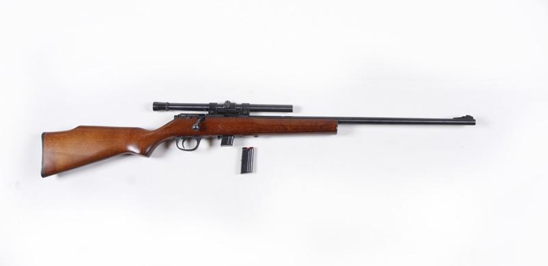 Nice bolt action .22 sporter with Weaver B6 scope. Blued finish, wood semi pistol grip stock with hard plastic but plate, 22" barrel with rear sight removed and ramp front sight still installed. Good bore and action.Condition: Excellent with little sign of use. Includes 2 magazines.
