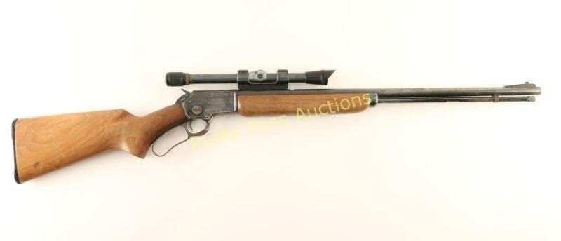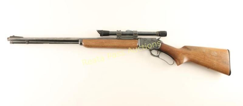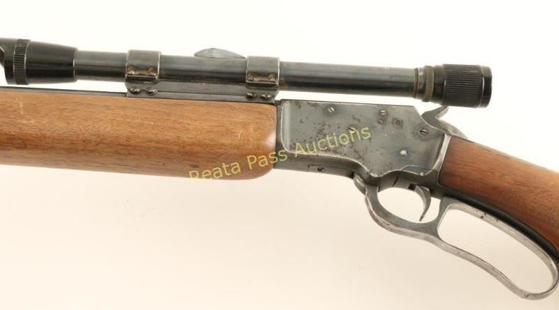 Blued steel takedown lever-action rifle with 2-piece wood pistol grip stock, 24" barrel, tube feed magazine, black plastic butt plate and an American Eagle 4-power scope. Rear iron sight has been removed. Bluing is worn on the barrel to a silver/grey with freckles from surface rust and there is one patch of pitted rust at the muzzle. The magazine tube has surface rust on it and patches are worn through to bare metal. The receiver has some surface rust and edge wear. Bottom of lever is worn to bare metal. The scope mount is attached to the barrel. Action works well. Bore is bright and shiny with good rifling. Wood has scratches and scrapes and is missing the Marlin "Bullseye" from the belly of the stock. The factory plastic buttplate has a white line spacer and is poorly fitted. Condition is fair to good. *Modern Firearm*