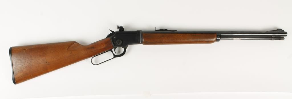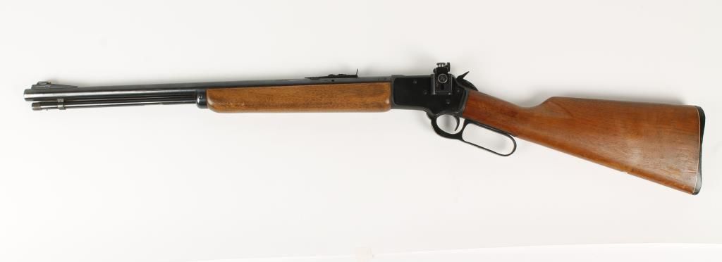Lever action rimfire take down "Mountie" carbine with 20" micro groove barrel. Blued finish, plain straight grip, capped forearm, replaced black plastic butt plate, full length tube magazine and fitted with receiver mount Lyman No.56 peep sight. Very good bore and action. Condition: Good showing light pinpricking on barrel and wood is good.