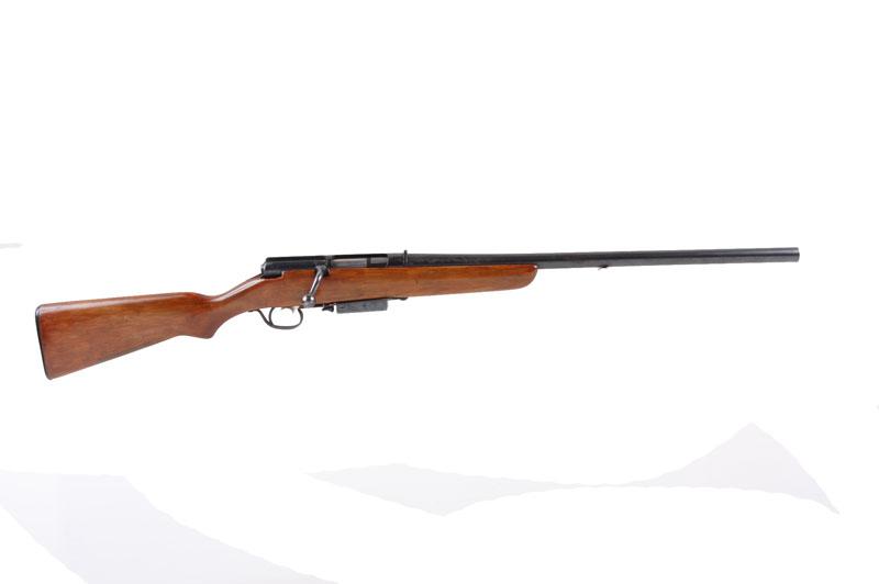 Condition: Good with some pitting developing on theBolt action box magazine field shotgun. Blued finish, smooth semi-pistol grip stock with hard rubber butt plate, 22" cut barrel with no bead, good bore and working action. Condition: Good with some pitting developing onthe barrel, and stock has repaired split. Screw missing from trigger guard. Includes 1 magazine.