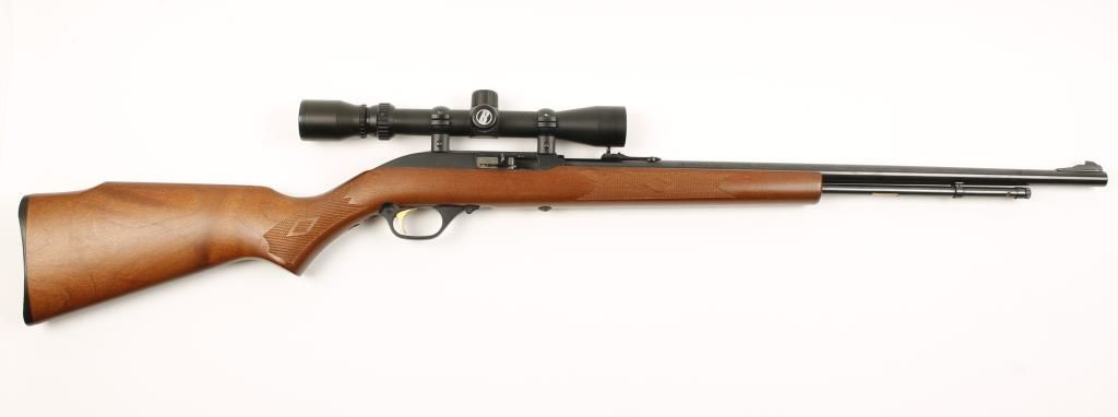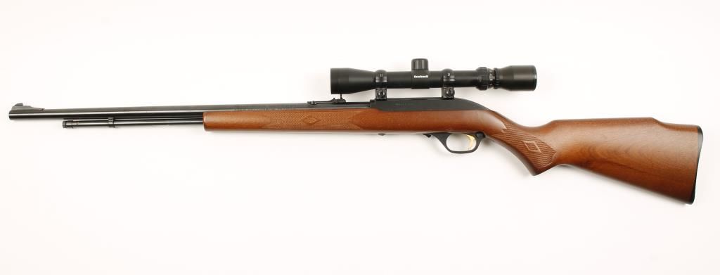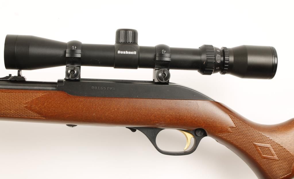 Semi auto rimfire rifle with 22" micro-groove barrel. Blued finish, checkered pistol grip wood stock, tube magazine, maintains original open sights and fitted with Bushnell 3-9X scope. Good bore and action. Condition: Very good to excellent showing very light use. *Modern Firearm*