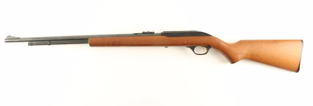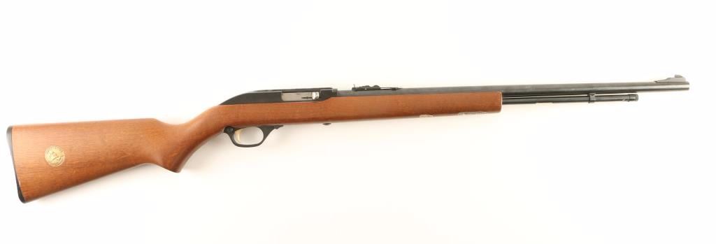 Tube-fed semi-automatic sporting rifle chambered in .22 Long Rifle. Features a blued 22" barrel, 3/4 tube magazine, ramped blade front sight, adjustable rear sporting sight, serrated gold trigger, push button safety, bolt hold-open lever, and smooth one piece pistol grip shoulder stock with imbedded "Safety Ethics Sportsmanship" medallion. Black finished receiver shows wear along the integral scope rail and blued barrel shows light surface rust emerging near the front sight. Action is sound, bore is excellent and wood stock is near fine. Condition is good+. ***Modern Firearm***