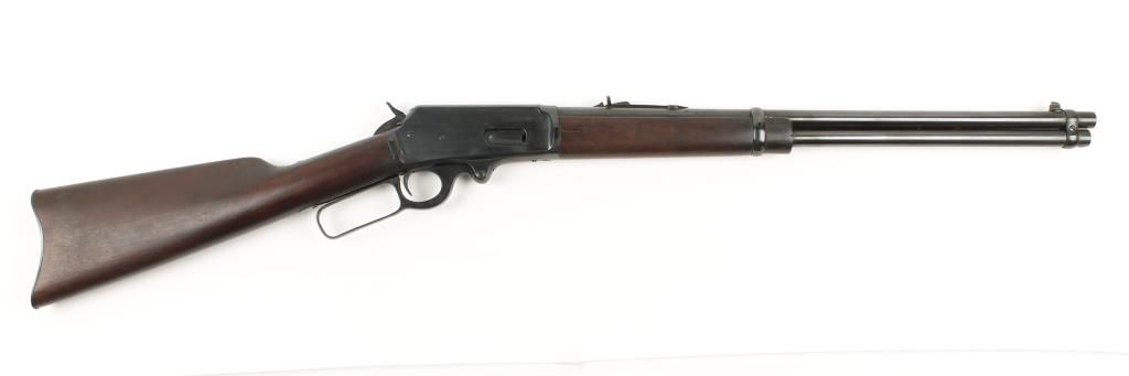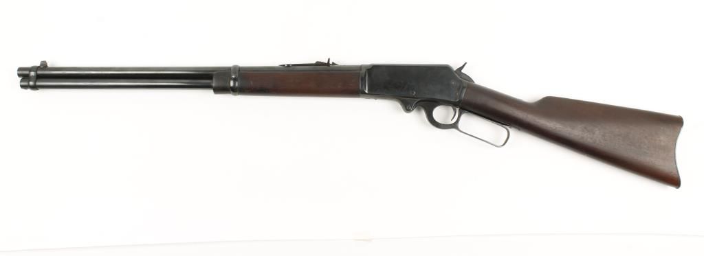 Lever action carbine with 20" octagon barrel. Reblued finish, plain straight grip walnut stock and forearm, Ballard type riflings and full length magazine. Good bore and action. Condition: Good as refinished.