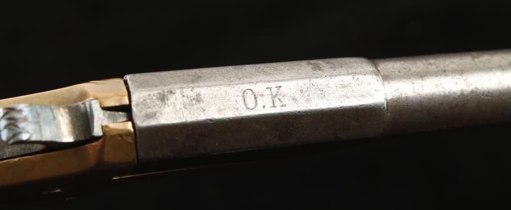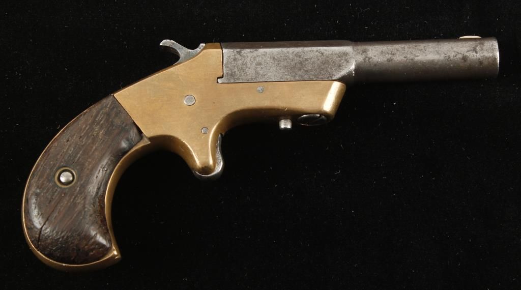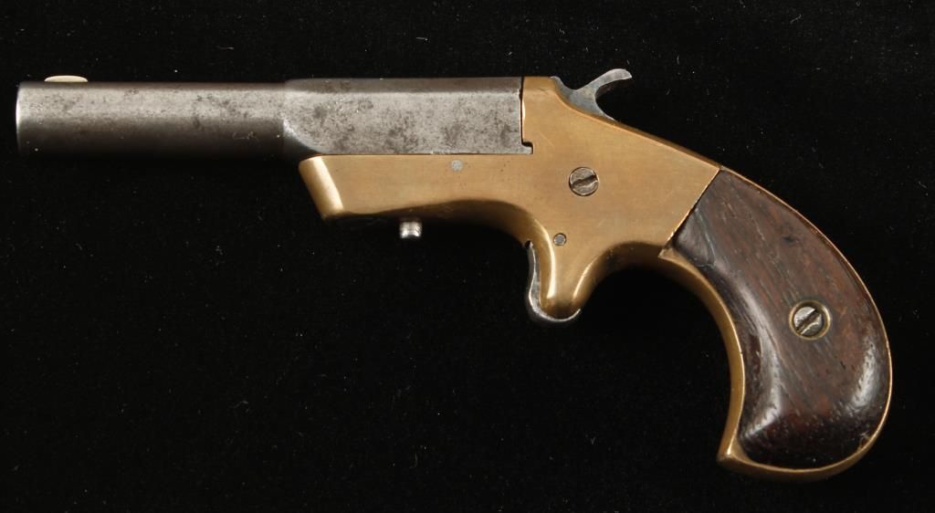 Single shot spur trigger pistol circa 1860's with 3-1/8" barrel. Brass frame, rosewood birdshead grips and fixed sights. Barrel pivots sideways for loading. Only markings are the "O.K." on top of barrel. Action in good working order. Condition: Fair to good showing light pitting on barrel and no finish remains. Grips are fair and show age. *Antique Firearm*