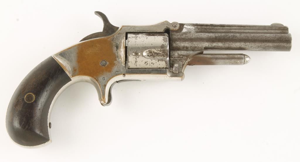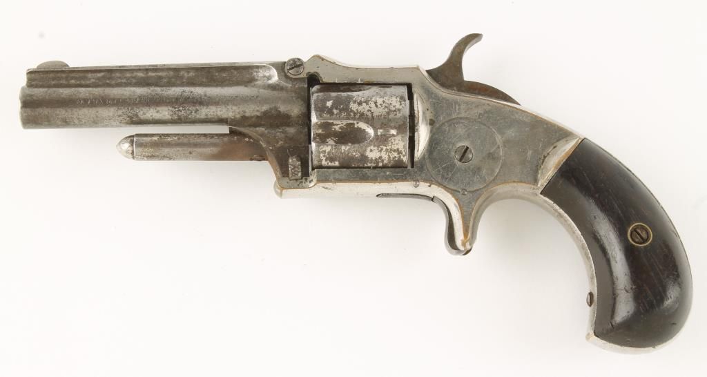 Later model single action spur trigger tip up 5 shot revolver with 3" round solid rib barrel. Nickel finish over brass frame, rosewood birds head grips, fluted cylinder, and fixed sights. Good bore and very good working action. Condition: In fine overall condition, showing 80% original finish, light pitting on receiver and cylinder, and grips are very good showing no loss. *Antique Firearm*