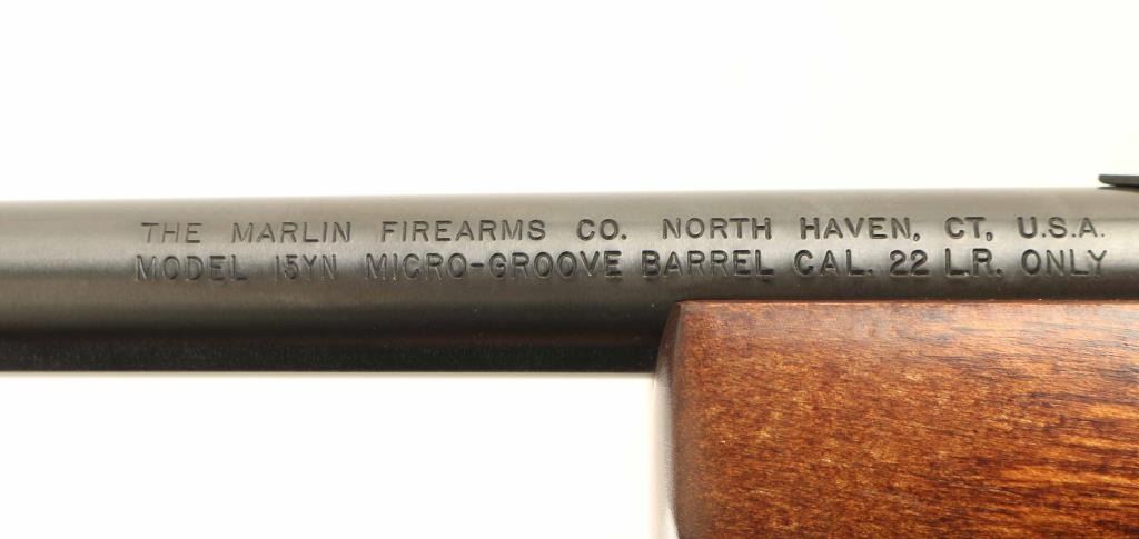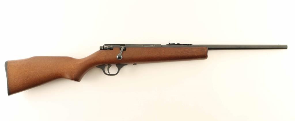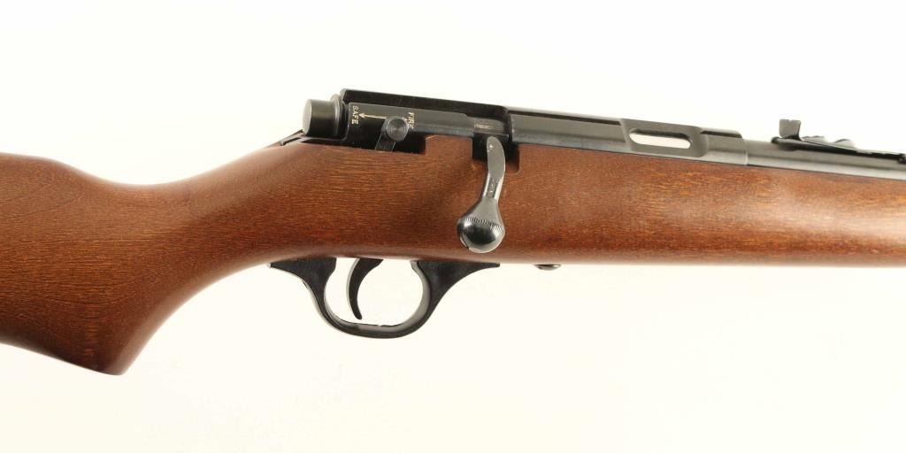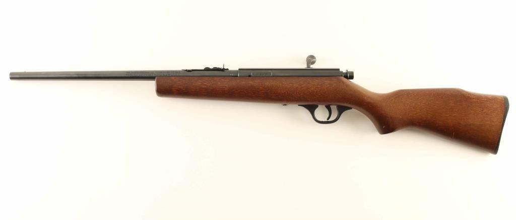 'Little Buckaroo' American made single shot bolt action youth rifle chambered in .22 Long Rifle. Features a blued finish, 16.25" "JM" marked barrel, removed front sight, elevation adjustable rear sporting sight, integral scope rail cuts in the receiver, serrated trigger, synthetic triggerguard, manual safety on the right side of the receiver, cocked indicator on the rear of the bolt, turned down bolt handle and pistol grip wood shoulder stock with factory buttplate & 11 13/16" LOP. Rifle exhibits approximately 95% of it's original blued finish showing light scattered wear and a small amount of dark rust. Action is sound, the bore is excellent and the wood stock is very good with blemishes & a hole in the underside of the butt from a previous swivel stud install. Condition is near NRA Very Good. ***Modern Firearm***