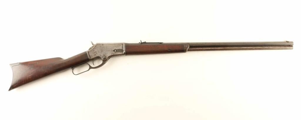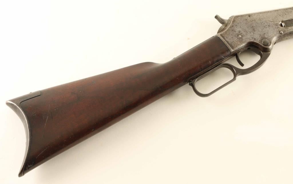 'Lightweight Model' lever action rifle manufactured circa 1886. Features 28" lighter profile octagon barrel, full length magazine tube, buckhorn sights, straight grip, steel crescent buttplate. Bore is fair to good condition, frosted & lightly pitted with strong rifling. Barrel & magazine tube show a mottled coloration with patina brown and lighter gray coloration. Receiver shows mostly gray colored bare metal with darker flecks of cleaned patina, with some small areas of shallow pitting. Buttplate is brown colored from even patina coverage with scattered remnants of darker gray or black coloration that appears to be paint. Screw slots show signs of the use of incorrectly shaped screwdrivers. Forend is fair condition, a bit loose, showing dents & cracks. Butt is good condition, dented & scratched, fancy figured grain visible thru a darkened & stained surface, some wood loss at corners of tang. Lever operates smoothly. Markings are generally sharp & readable, with overlaid patina. Condition is NRA Very Good *** Antique Firearm ***