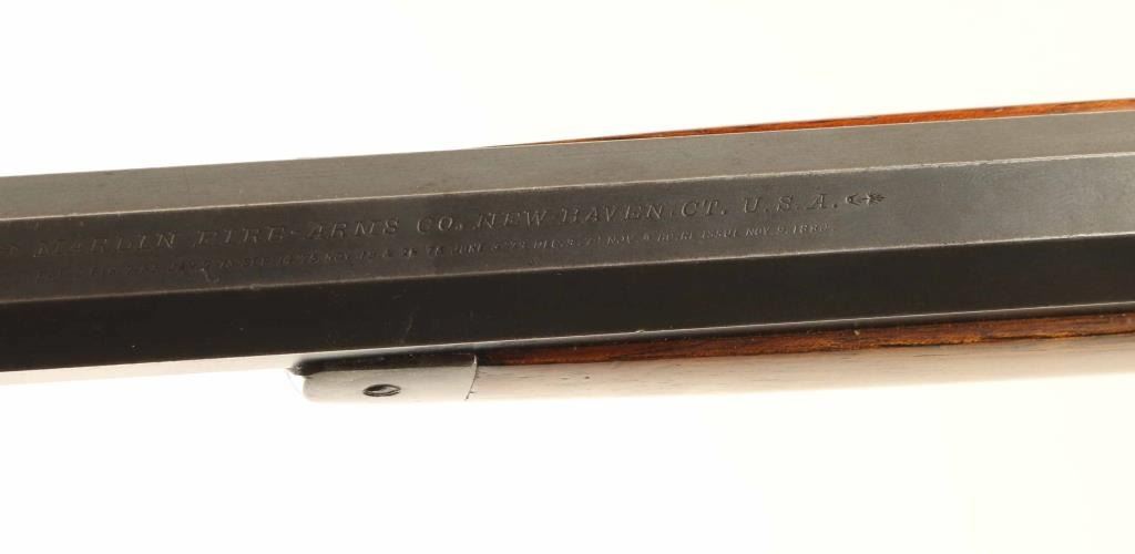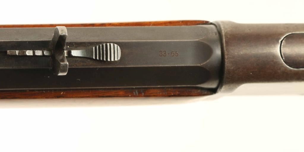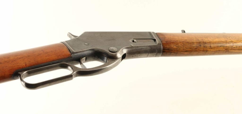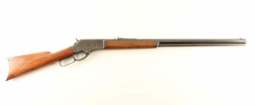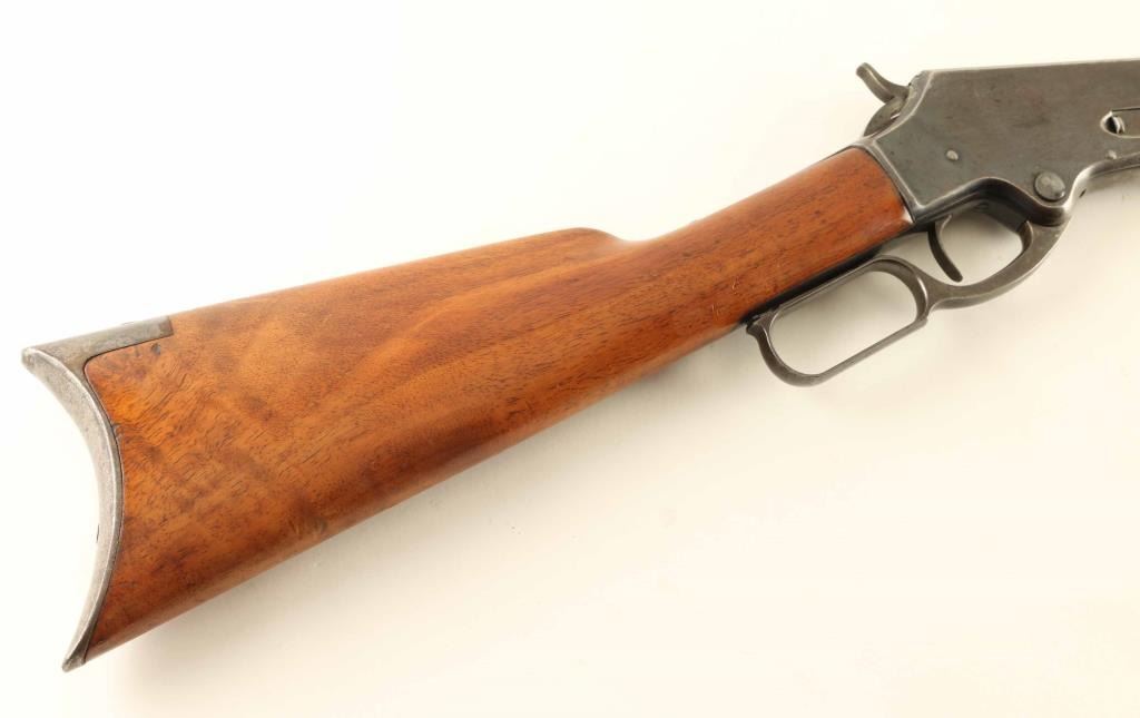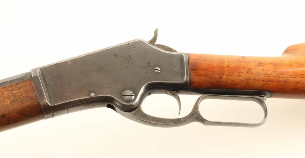 'Lightweight Model' lever action rifle manufactured circa 1887. Features 28" octagon barrel, full length magazine tube, buckhorn sights, straight grip, steel crescent buttplate. Bore is very good condition. Retains majority coverage of fading finish, turning brown around edges of receiver, on magazine tube, edges of barrel flats. Bare metal shows on sharp edges or where moving parts rub. Receiver sides show dishing around screw holes, indicating polishing during refinish. Buttplate is bare metal with thin even coverage of patina giving a brown coloration. Screw slots show marring. Wood is good solid condition, cleaned and refinished, older dents show dark coloration, with good fit to metal. Lever operates smoothly. Two line barrel address appears less deep at second line, and towards right side of lettering. Condition is NRA Very Good - refinished *** Antique Firearm ***