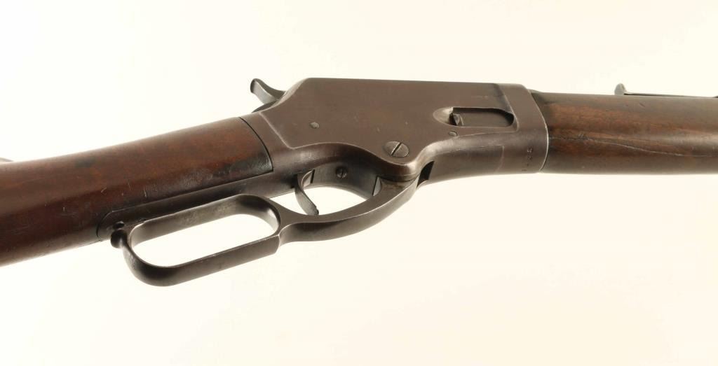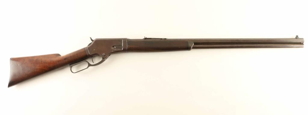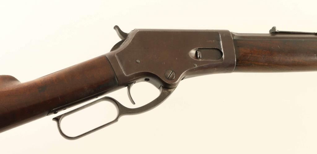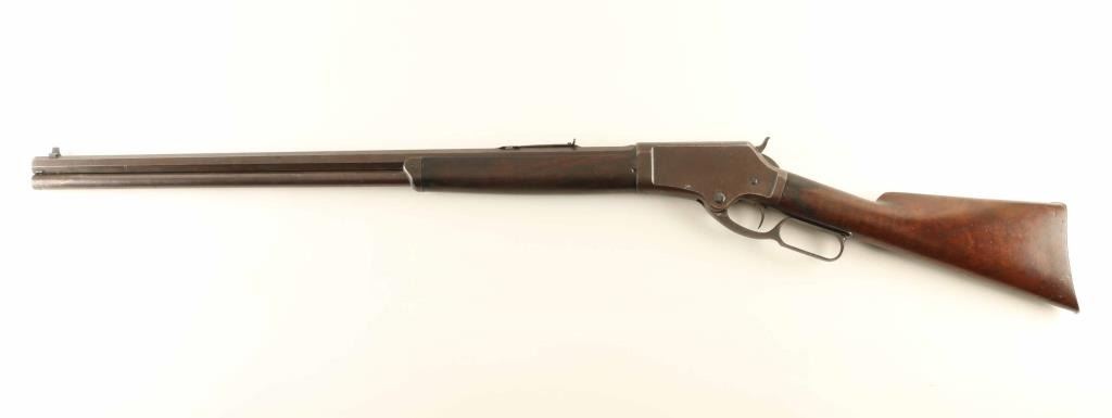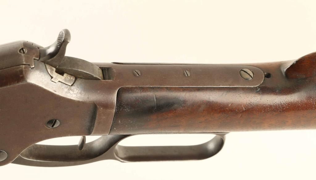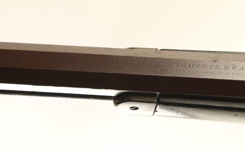 Lever action rifle manufactured circa 1881 - 1883. Features 28" octagon barrel, full length magazine tube, buckhorn sights, straight grip, curved steel buttplate. Bore is very good condition. Metal surfaces show 90% coverage of a smooth brown color patina, with scratches and dents, some light pitting in places, bare metal on sharp edges or where moving parts rub. Buttplate is polished bare metal. Most screw heads show some marring. Forend is fair condition, showing a long crack along the bottom and several deep dents & gouges. Butt is good condition, dented & scratched, showing some fiddleback figure in the walnut, some staining at wrist & near buttplate. Lever operates smoothly, sits a little loose when action is closed. Two line barrel address appears shallow but even & readable. Condition is NRA Very Good *** Antique Firearm ***