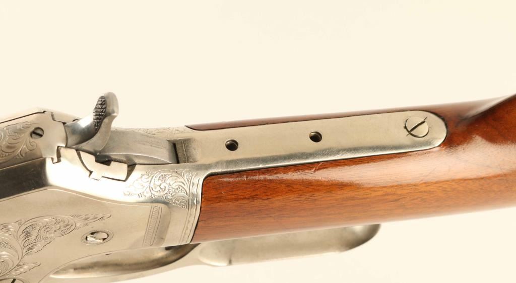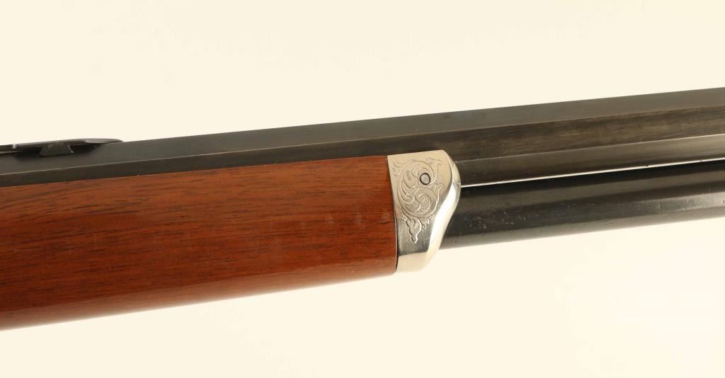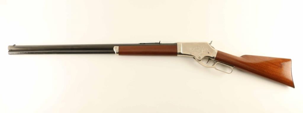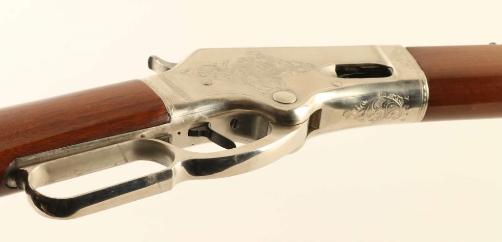 Lever action rifle manufactured circa 1884. Engraved & Finished by David Wade Harris. Features 28" octagon barrel, full length magazine tube, buckhorn sights, straight grip, double set triggers, nickel finished action, curved steel buttplate. Bore is good to very good condition, bright with sharp rifling. Retains 85% re-blued finish on barrel and magazine tube, thinning and graying on edges of flats, streaks of discoloration along right side of barrel, visible small pits and dents under refinish. Action displays 50% coverage of all surfaces with floral scroll engraving, finished with very good to excellent nickel plating. Buttplate is smooth with mottled gray and light brown color. Screw slots are generally good with hammer screw showing significant marring. Small dents surround receiver pin locations. Holes for tang sight are missing the plug screws. Loading gate door does not have spring closed. Wood is very good condition, some small dents & scratches, varnished, good fit to metal. Lever operates smoothly. Second line of two line barrel address appears shallow. Condition is NRA Very Good as refinished *** Antique Firearm ***
