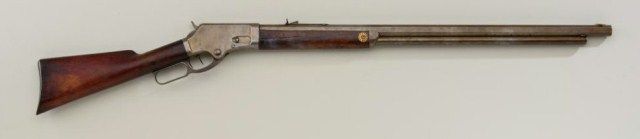 Marlin Model 1881 Special Order rifle, .45-70 cal., 30” heavy octagon barrel, double set triggers, #5180. This rifle comes with a signed letter of provenance stating the rifle belonged to Dr. DeCock who was an MD whotreated an Indian Chief in the Southern California high desert area and was given the rifle 50 years ago or more for his services. The rifle shows a small brass plaque attached to the front of the fore end with an Indian Sun symbol-type design. The metal surfaces show a grey/brown patina with slight traces of blue mixed in, some scattered light to moderate erosion, pin prick pitting; the barrel address is good, edges fairlysharp; the stock is fair to good with split and repair to fore-end, two large cracks in the butt stock and large loss of wood along top edge on left side of fore end. The action is good, the bore is fair to good and clean, the barrel measures 7/8” across the center; the front sight is a period rocky mountain blade type in the original post, set in the correct dovetail with a period or factory rear sight, also in its correct position. A