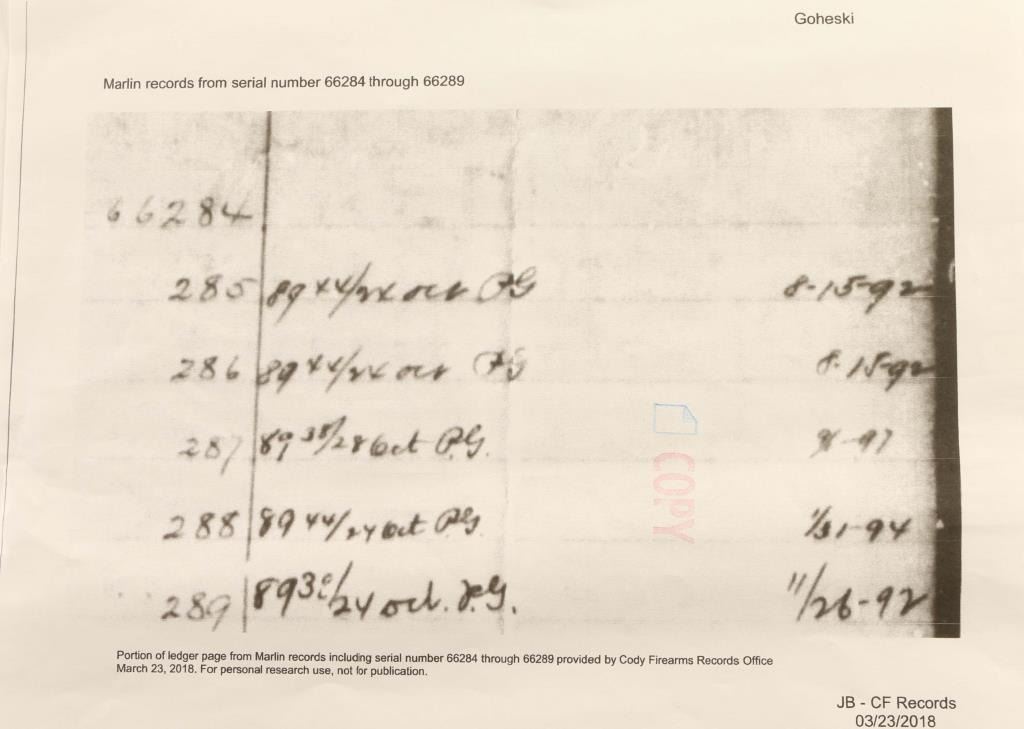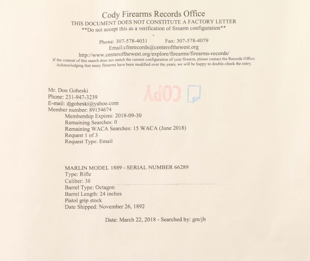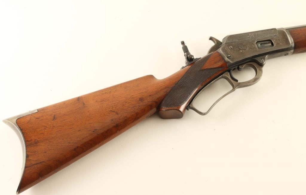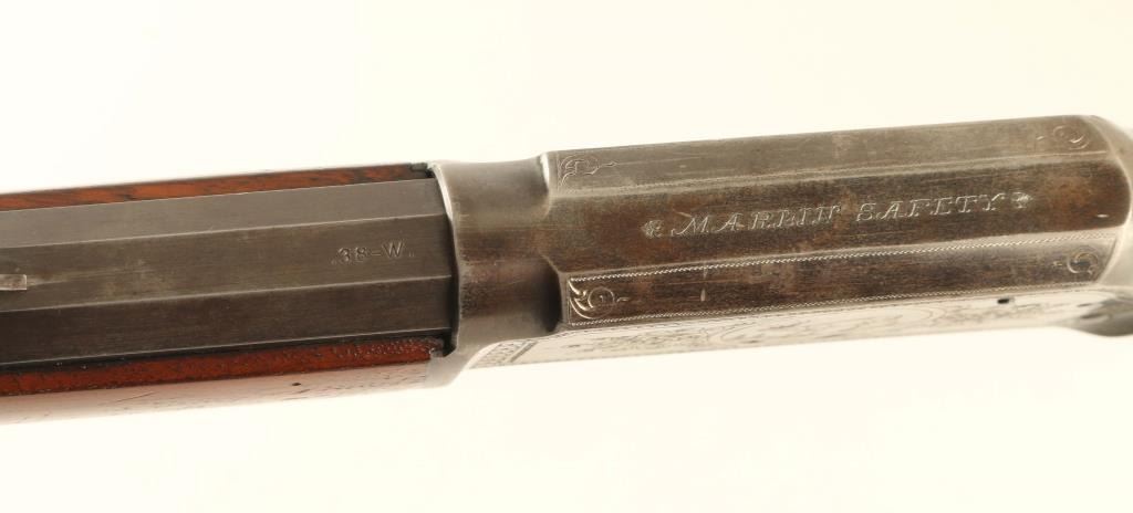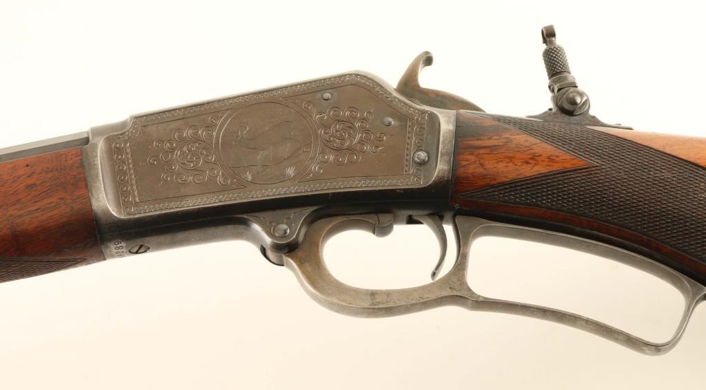 Engraved antique lever action repeating rifle chambered in .38-40 Winchester, manufactured in New Haven, CT circa 1892. Configuration: Blued finish, 24” octagonal barrel, full-length tube magazine, Rocky Mountain front sight with German silver blade, elevation adjustable flat-top rear sporting sight, tang mounted Lyman Combination Peep sight, smooth trigger, case hardened hammer with knurled spur, Ulrich #1 pattern engraving on the receiver featuring foliate arabesque patterns & whitetail buck on a mountain scene on the left side, curved case hardened finger lever, grip safety, nicely figured American walnut forend with diamond pattern checkering & steel cap, and serpentine grip shoulder stock with crescent metal buttplate & 13” LOP. Matching serial numbers are found on the bottom of the receiver, on the left side of upper tang and in the top tang channel of buttstock. Includes a document from the Cody Firearms Record Office and a photo of the leger page from Marlin records both stating the rifle is a model 1889 in 38 caliber with 24” octagon barrel & pistol grip stock that shipped 11.26.1892. Rifle retains approximately 20% thinned bluing with some bright bluing & vivid case colors preserved in the protected areas and the remained of the metal surfaces displaying an aged brown patina. Action is smooth, the bore shows good luster & rifling with scattered pitting and the refinished wood stocks are good with 1.5” crack on the right side of the buttstock near the toe. Condition is near NRA Fine. ***Antique Firearm***
