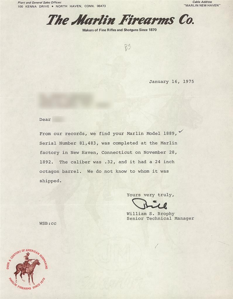 Marlin Model 1889 Lever Action Rifle with Factory Letter
