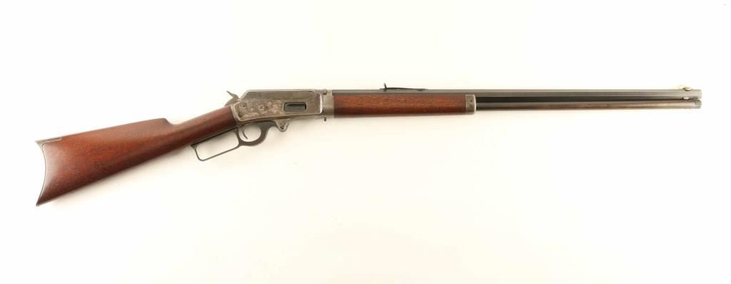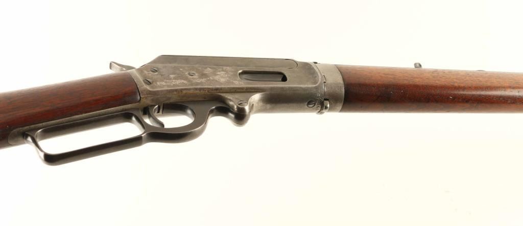 Take-down lever action rifle manufactured circa 1902. Features 26" octagon barrel, full length magazine tube, buckhorn sights, straight grip, steel crescent buttplate. Bore is good condition, frosted with strong rifling. Barrel and magazine tube retain majority coverage of a dulled and grayish blue, turning brown on much of mag tube, with bare metal showing at several scuffs & scrapes, at edges of flats. Action appears case colored, mostly a mottled gray color. Lever retains majority coverage of dark blued finish. Buttplate is a dark grayish color. Screw slots are good with some marring. Top of receiver is drilled & tapped, holes filled with plug screws, at least one hole appears a bit off centerline. Wood is very good condition, good fit to metal, visible scratches & dents. Action is smooth. Markings are crisp. Condition is NRA Very Good - varnished wood *** C&R Firearm ***