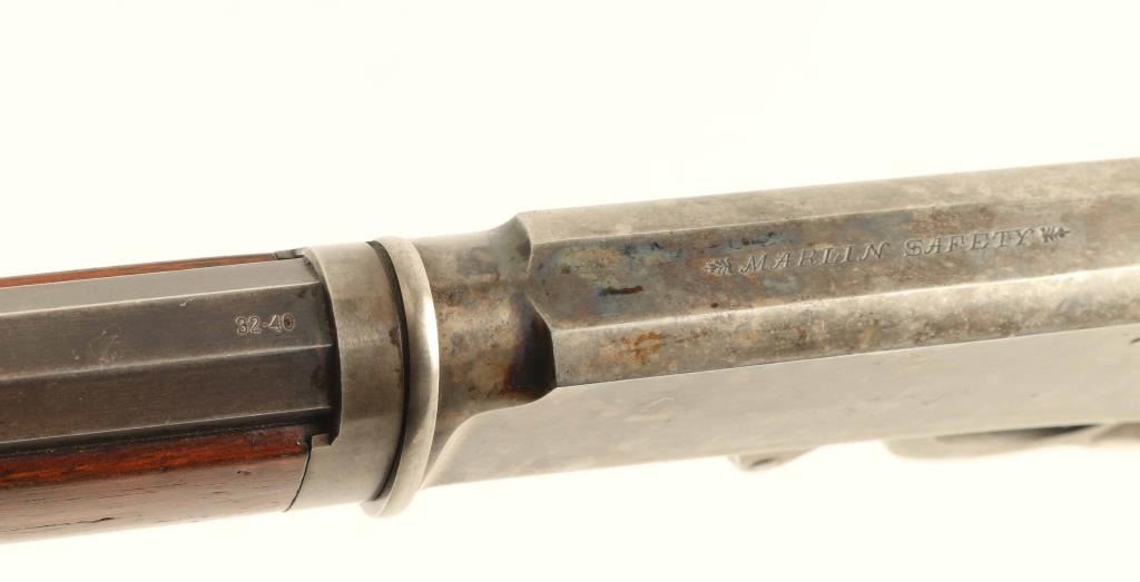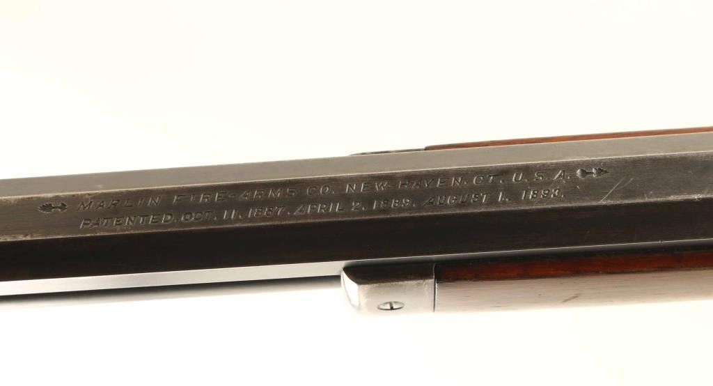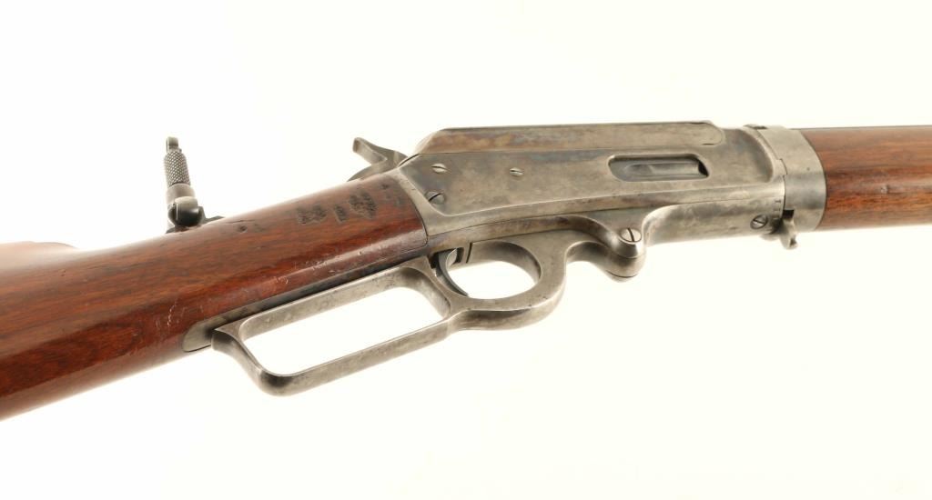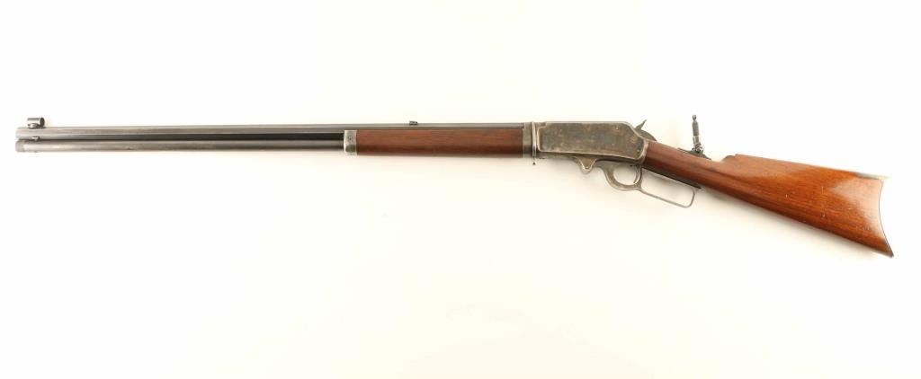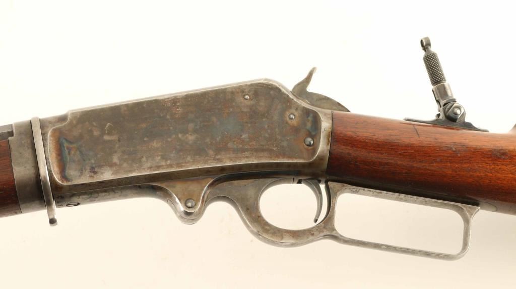 Take-down lever action rifle manufactured circa 1894. Features 28" octagon barrel, full length magazine tube, hooded blade front sight, folding leaf rear sight on barrel, tang mounted Lyman folding rear peep sight, straight grip, steel crescent buttplate. Bore is good condition, frosted with strong rifling. Barrel and magazine tube retain majority coverage of a dulled and grayish blue, with bare metal showing at several scuffs & scrapes, at edges of flats. Action appears case colored, retaining some fiery color in places, mostly a mottled gray color. Buttplate is grayish bare metal with some patina at edges. Screw slots are good with some light marring. Wood is good condition, good fit to metal, visible scratches & dents, row of gouges on right side of wrist, varnished finish. Action is smooth. Markings are crisp. Condition is NRA Very Good - varnished wood *** Antique Firearm ***