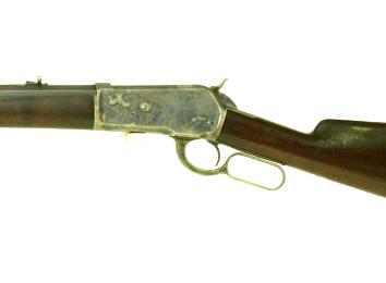 lever action rifle with 26" octagon barrel, full magazine and deluxe checkered walnut stocks. Rifle has been expertly restored and refinished with blued barrel and magazine. The receiver, hammer, lever and crescent butt plate case hardened. Manufactured 1893-1935, excellent action and bore, NO FFL required.