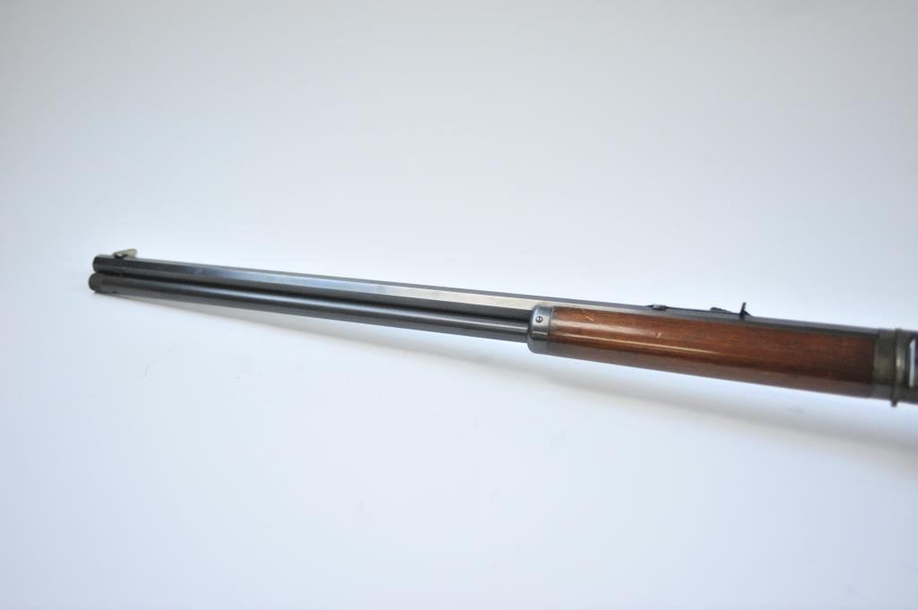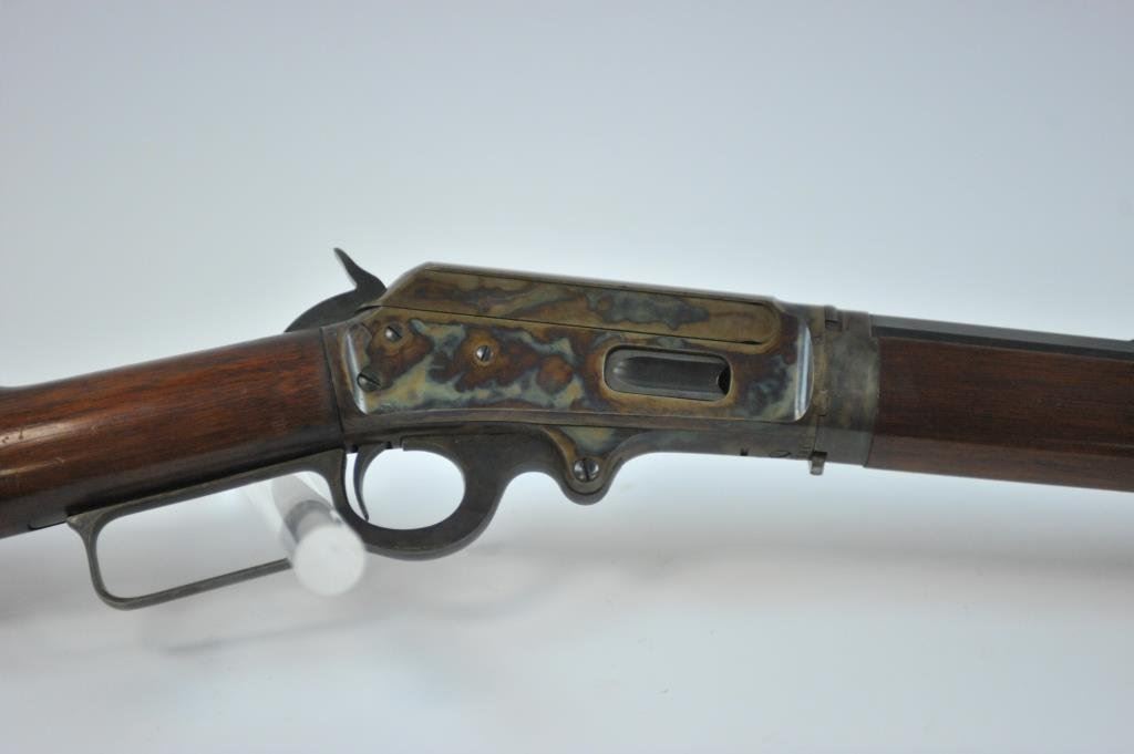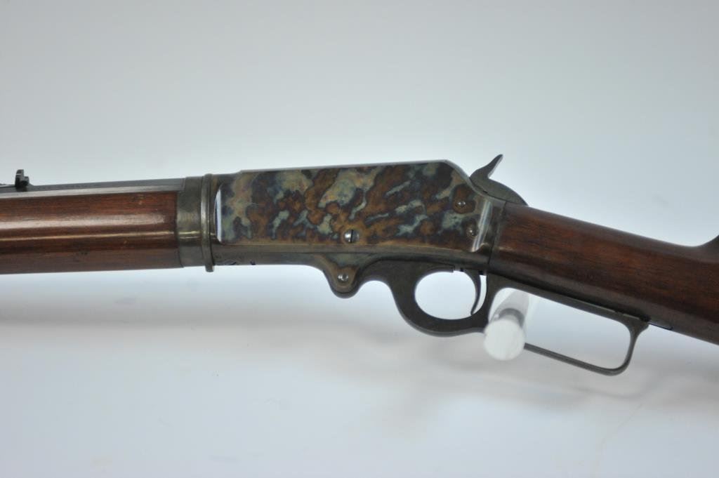 .30-30 caliber, S/N D81845 with a 26” octagon barrel, full magazine and crescent butt with blue and case hardened finish. This rifle remains in stunning original condition with 98%-99% plus original blue and fiery case colors showing rainbow hues with the original lacquer remaining. The stocks are excellent with minute storage marks. Sharp and crisp with excellent markings. A strong 9.9 on a 42745 scale and almost impossible to improve upon. (C&R) Est.: $3500-$7000