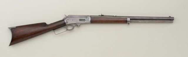 Marlin Model 1893 “Marlin Safety” lever action short rifle, .38-55 cal., 20” octagon barrel, blue finish, wood stocks, #154467. This gun is in overall good to very good condition showing an even grey patina, withplum toning in protected areas, on metal surfaces, good bore, crisp action, very good markings and wood stocks. Est.: $900-$1,800.