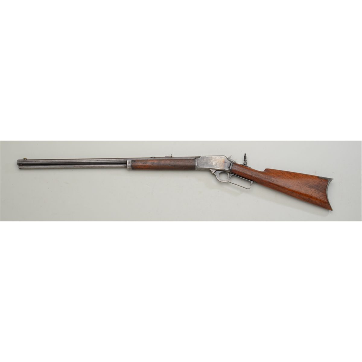 Marlin Model 1893 lever action rifle, .32-20 cal., 24” octagon barrel, blue and case hardened finish, wood stocks, #149851. This gun is in overall very good condition showing a light brown patina on barrel assembly andsilvery brown patina on receiver, very good bore, crisp action and markings, overall good wood stocks with some wear, mars and scratches on butt stock including several moderate old dings on the right side of thebutt stock; adjustable tang sight. Est.: $300-$600.